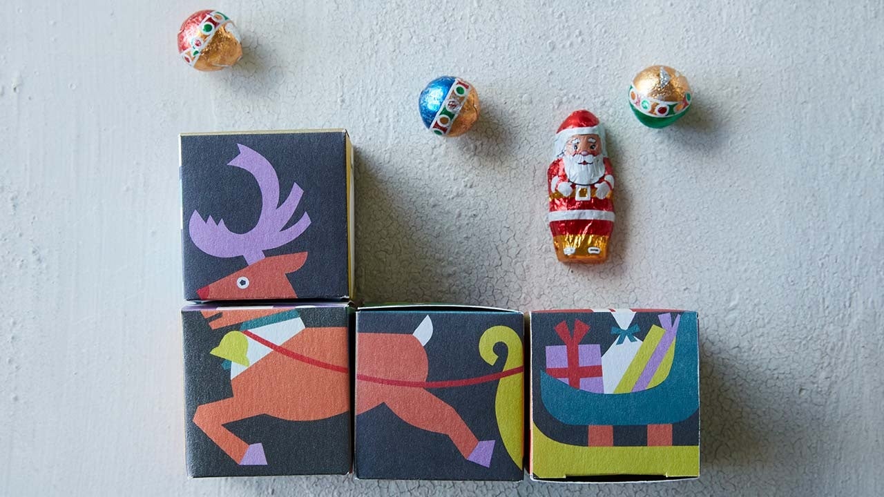 ボックスの側面に描かれたイラストを組み合わせると、全部で5つの絵柄と物語が生まれます。ボックスの中にはサンタや兵隊、スノーマンを模したホイルチョコレート入り。チョコレートを頬張りながら、クリスマス当日を待ちわびる時間をたのしみましょう。