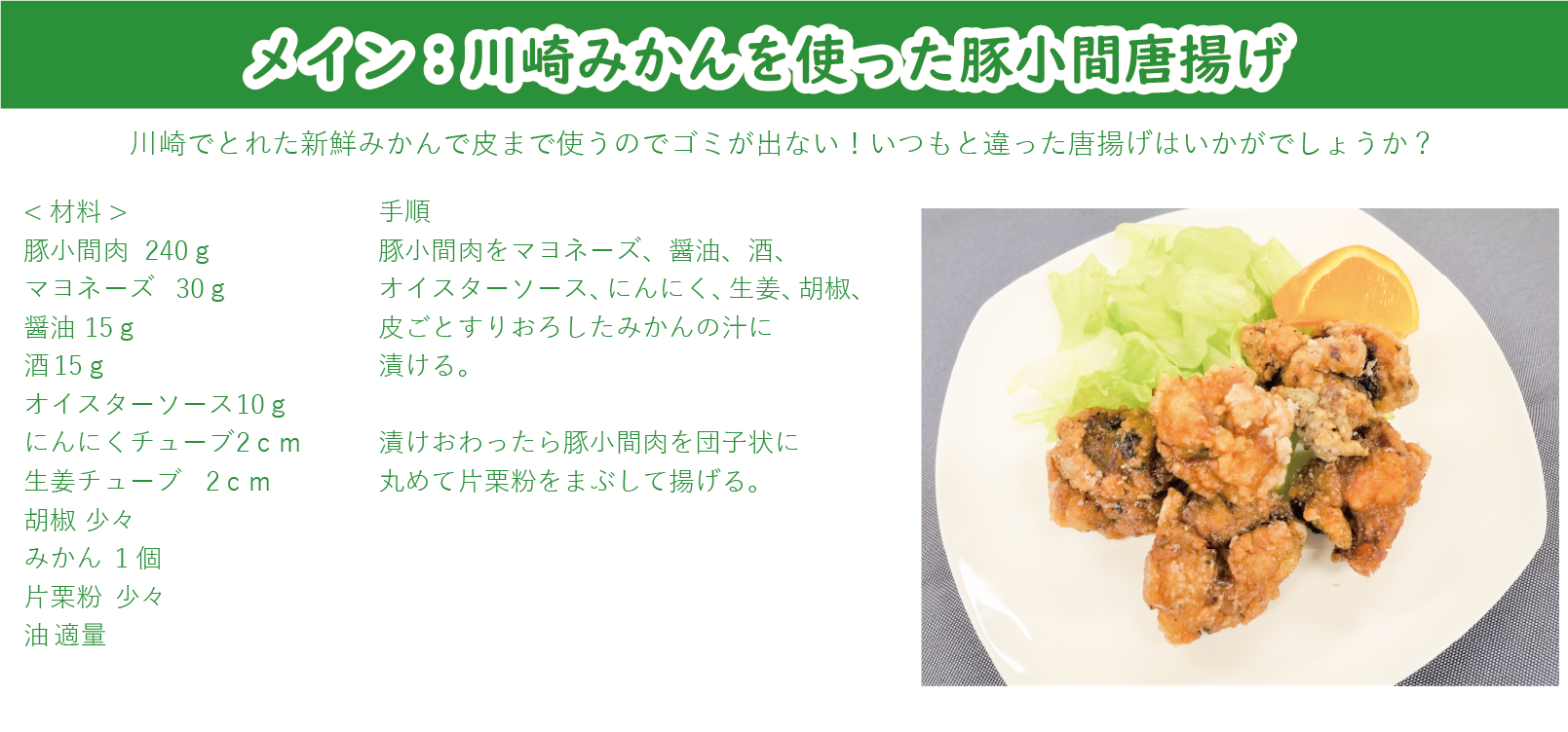 川崎市の地産食材をもっと知ってもらい、もっと使ってもらいたいという思いから、3社がコラボをして、川崎市内産農産物で「SDGs給食レシピ」を開発しました。SDGsの観点から、食材を極限まで使い切り廃棄を出さない食品ロス削減のレシピとなっています。