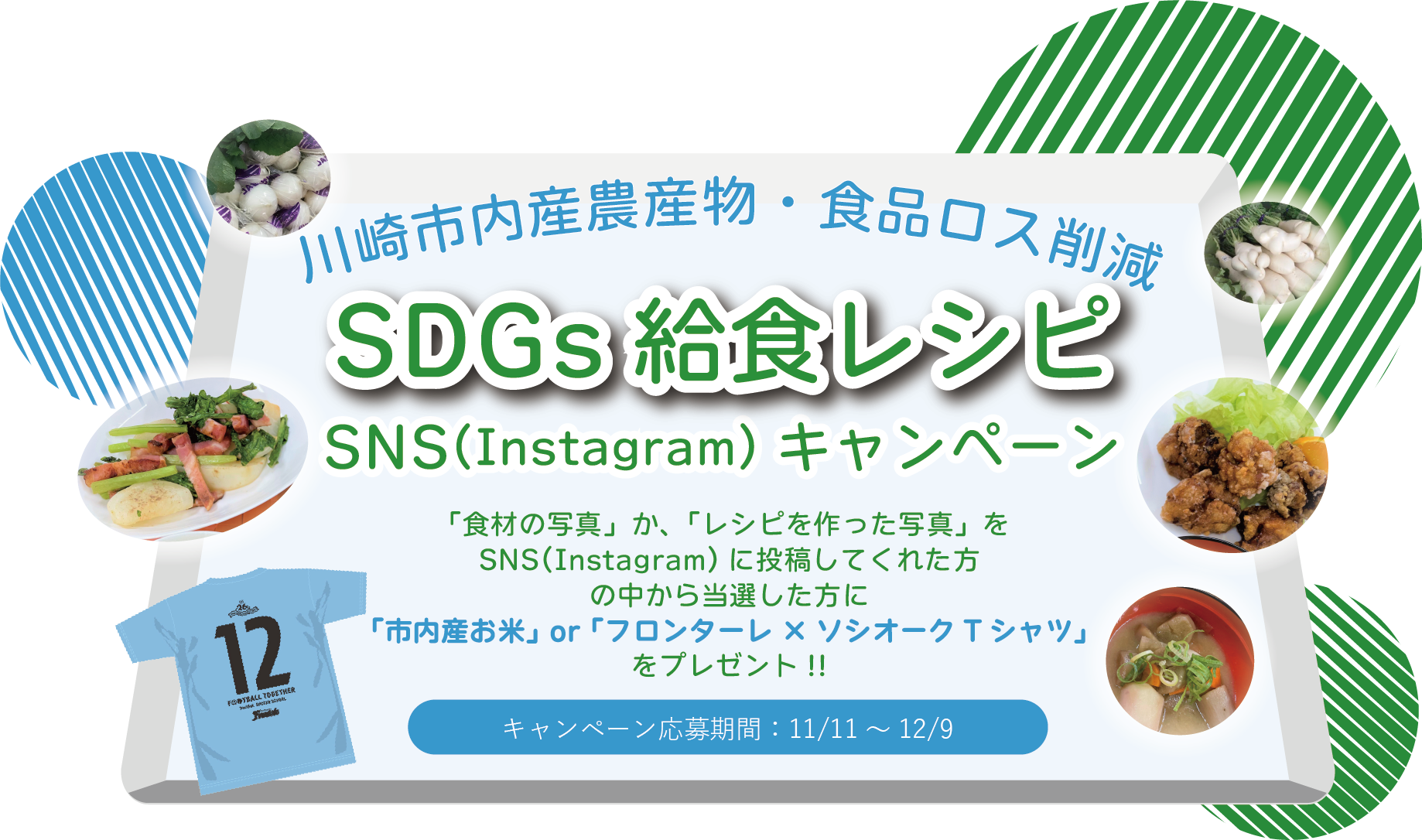 「SDGs給食レシピ」のどれか一品を作り、「#SDGs給食レシピ #ソシオーク」のハッシュタグをつけてSNS(Instagram)へ写真を投稿すると、投稿された方の中から抽選で「川崎フロンターレ×ソシオーク」Tシャツが当たります。
