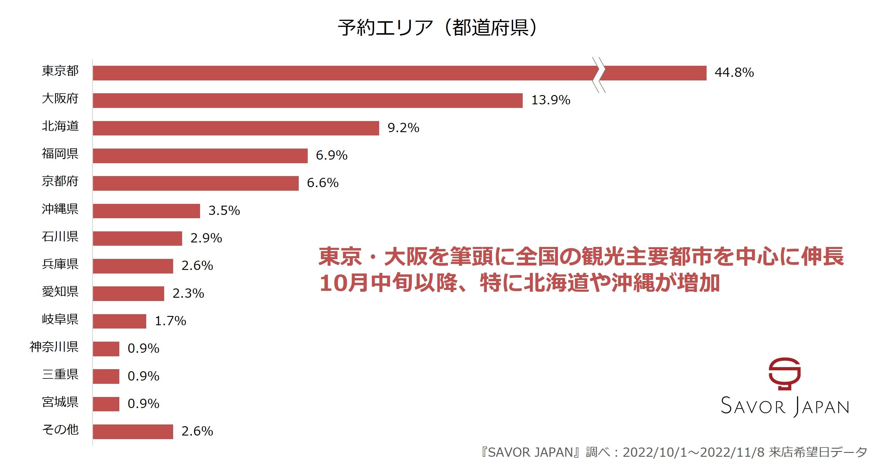 またレストランのエリアとしては東京、大阪を筆頭に観光主要都市部への予約が多く、トップ10は、東京(44.8%)、大阪(13.9%)、北海道(9.2%)、福岡(6.9%)、京都(6.6%)、沖縄(3.5%)、石川(2.9%)、兵庫(2.6%)、愛知(2.3%)、岐阜(1.7%)となりました。
