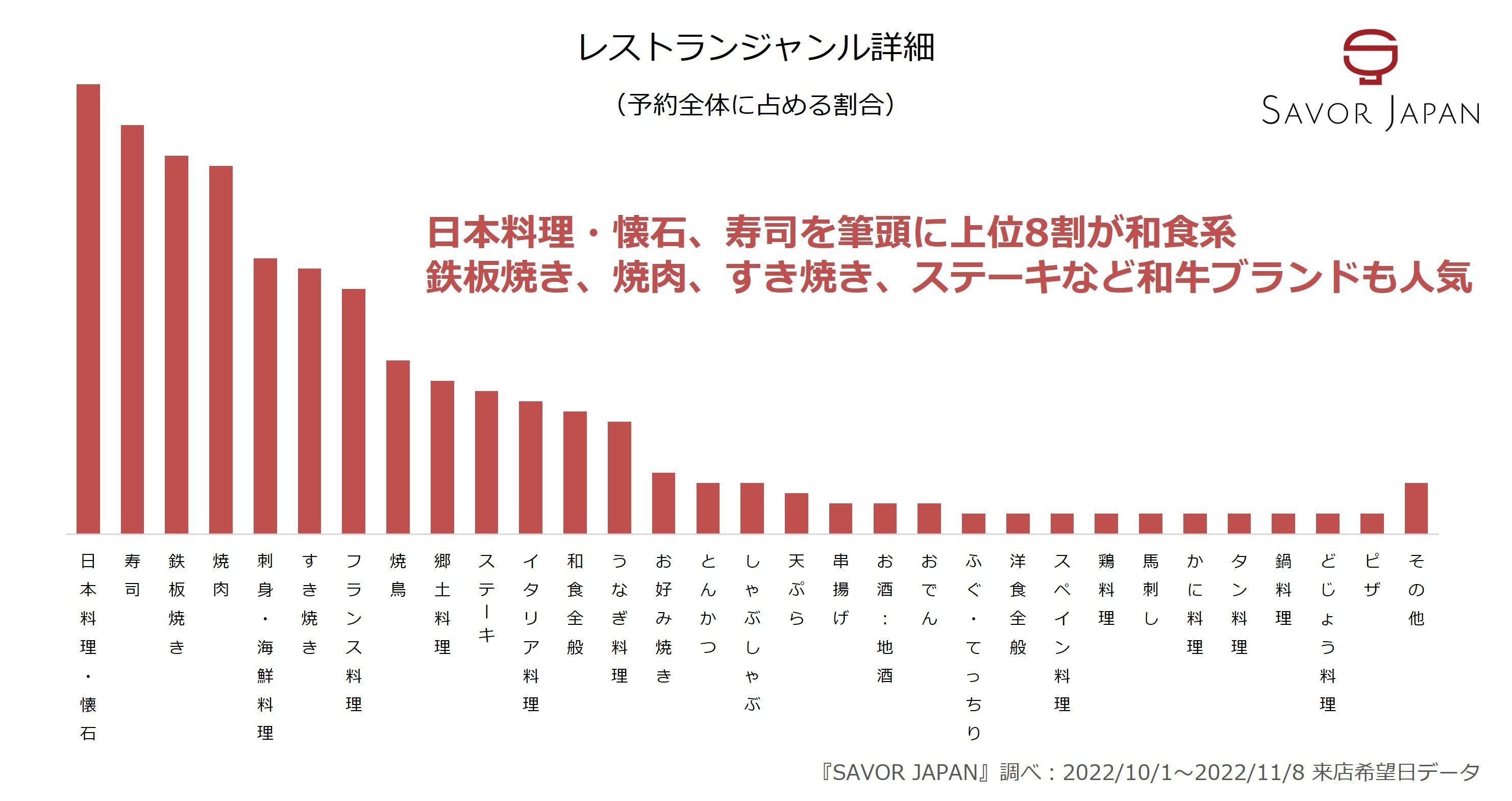 ジャンル別では「和食」が予約全体の82.2%を占めました。和食の代名詞とも言える寿司、懐石、刺身などが上位に並ぶ一方、鉄板焼、焼肉、すき焼き、ステーキなど、ジャンルを超えて肉料理の占める割合が40.0%にのぼり、和牛や国産銘柄への人気の高さもうかがえる結果に。詳細を見ると、日本食からフレンチ、イタリアンまで、実に幅広いジャンルの「食」が求められていることが分かります。