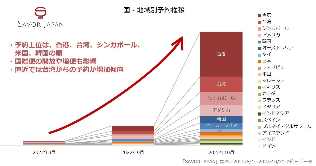 『SAVOR JAPAN』を通じて行われた飲食店の予約数は、2022年9月23日の海外個人旅行(FIT)解禁発表から急増し、以降上昇基調で推移。受入解禁日の10月11日からさらに伸び、11月現在も増加傾向が続いています。