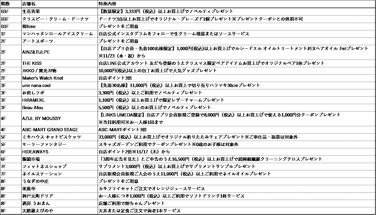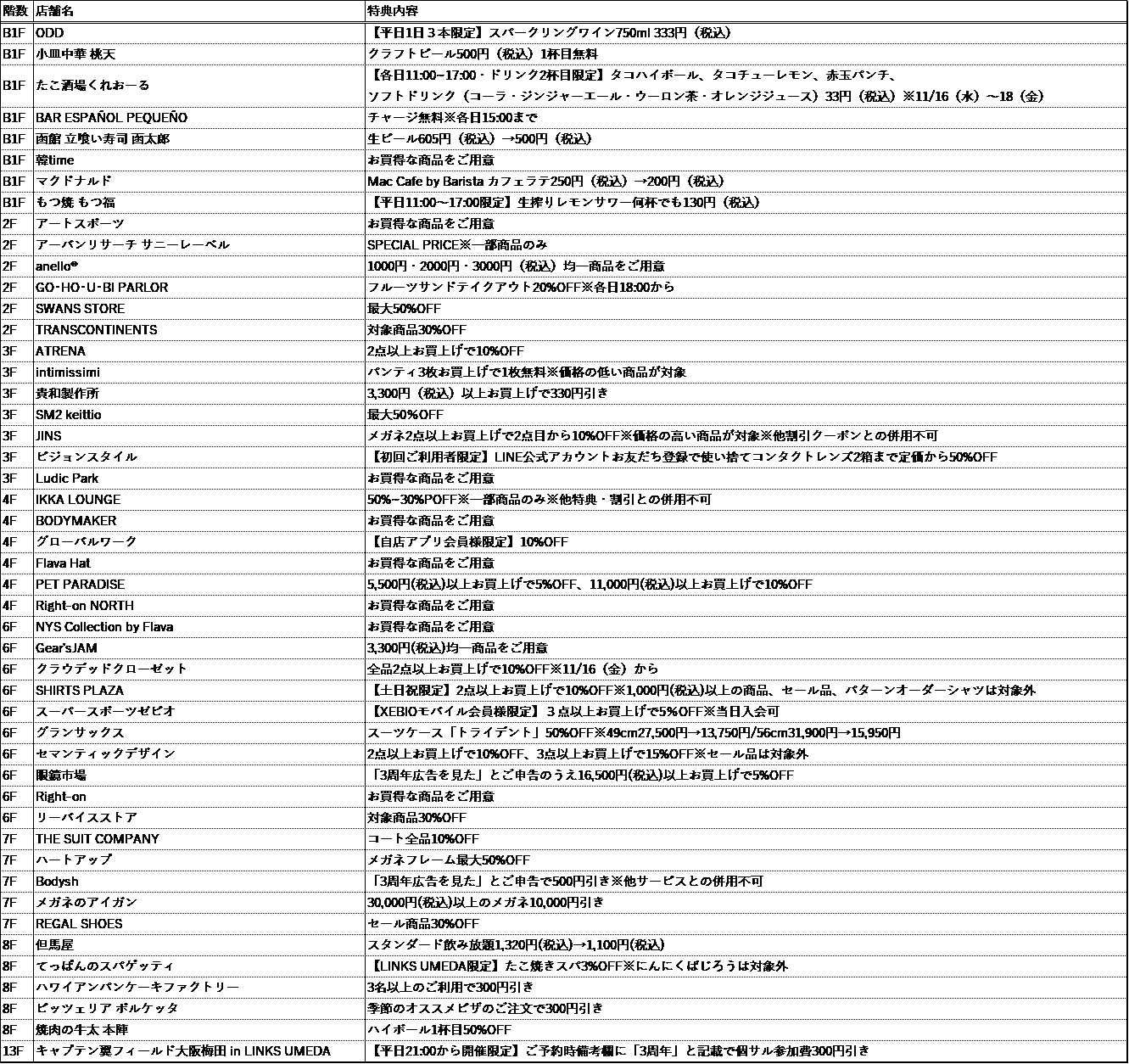 - LINKS UMEDA3周年祭の楽しみ方1=お得なセールに個性豊かな店舗が参加!=