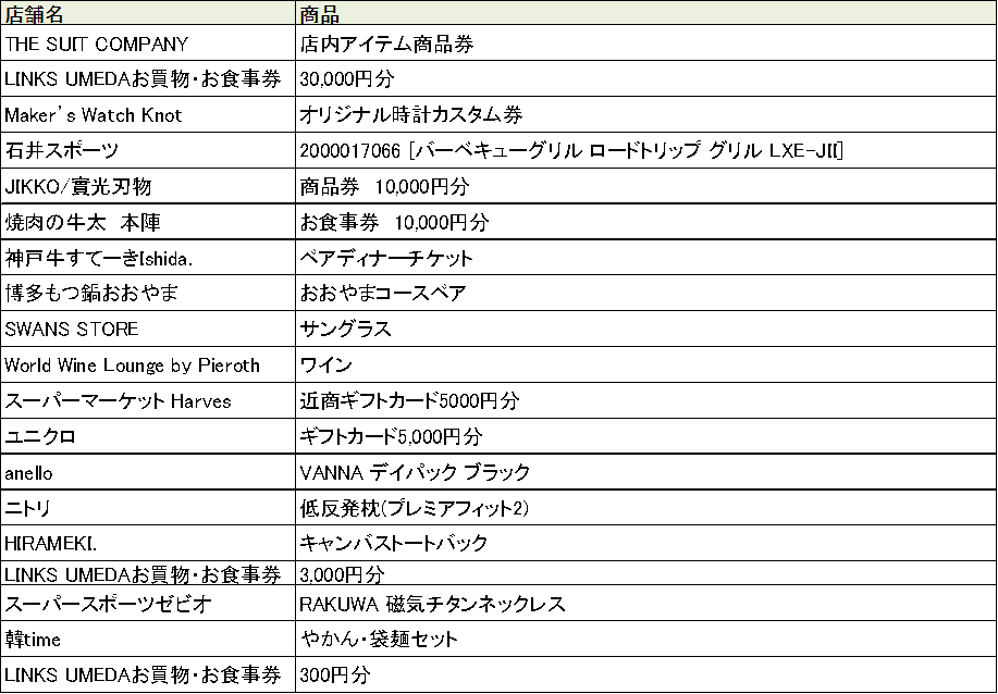 3,000円ごとのレシート(税込・合算可)提示で参加でき、賞品はLINKS UMEDAのみで利用できる商品券や