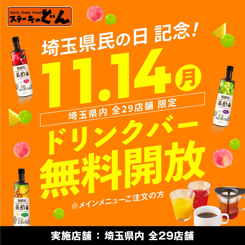 「ステーキのどん」では、日頃のご愛顧への感謝を込め、2022年11月14日(月)の「埼玉県民の日」特別企画として、県内全29店舗でメインメニューをご注文のお客様を対象に『ドリンクバー無料開放』キャンペーンを実施いたします。