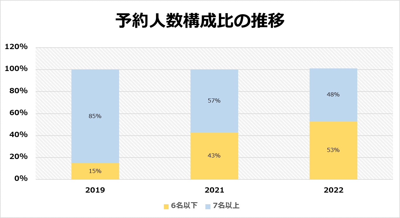 2019年(コロナ前)に対して少ない人数で忘年会を行おうとする意識は、増していく傾向にあると考えられます。当社で実施した意識調査からも理想とする忘年会は6人以下という結果が出ています。行動制限が解除された中でも、少しでも少人数で忘年会を行おうとする意識は、今年ならではの傾向であると考えられます。