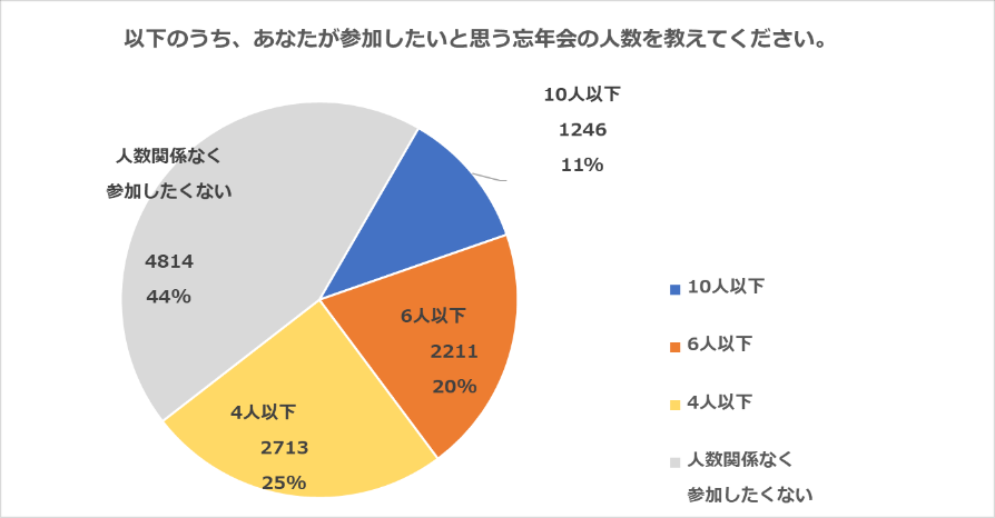 忘年会に関する意識調査を行った結果、参加したいと思う忘年会の人数は、6人以下と4人以下で約4.5割を占める結果となりました。これは、コロナ禍も影響し、少人数で忘年会を行うプチ忘年会の傾向が今年はあると考えられます。