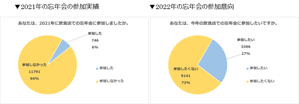 2021年と2022年の忘年会の参加実績と参加意向を比較すると、約21%のアップになり、不参加実績と不参加意向を比較すると、約21%のダウンという結果になりました。