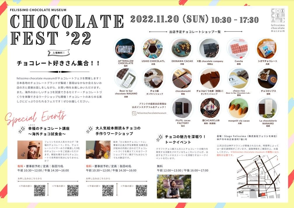 フェリシモが展開する「felissimo chocolate museum[フェリシモ チョコレート ミュージアム]」は、11月20日(日)に神戸で開催する入場無料イベント『CHOCOLATE FEST’22』、チョコフェスのタイムテーブルを発表しました。神戸市中央区にあるStage Felissimo 1Fホールと3Fで催されるイベントです。チョコレート コンシェルジュの「ちょこれいじさん」が日本を旅して出会ったクラフトチョコレートをてがける16店舗が出店、一度に巡ることができ、その場で購入できます。 同日開催されるコンテンツに、絵本『ひと粒のチョコレートに』(月刊たくさんのふしぎ2021年4月号 福音館書店)の著者 佐藤清隆氏によるチョコレート作りのワークショップ(有料)や、フェリシモのチョコレートバイヤーみりがセレクトした海外チョコを試食し、世界を旅するかのようにチョコレートを知ることができる「幸福(しあわせ)のチョコレート講座」(有料)も実施します。1日中、チョコレートを楽しみ尽くすことができるイベントです。