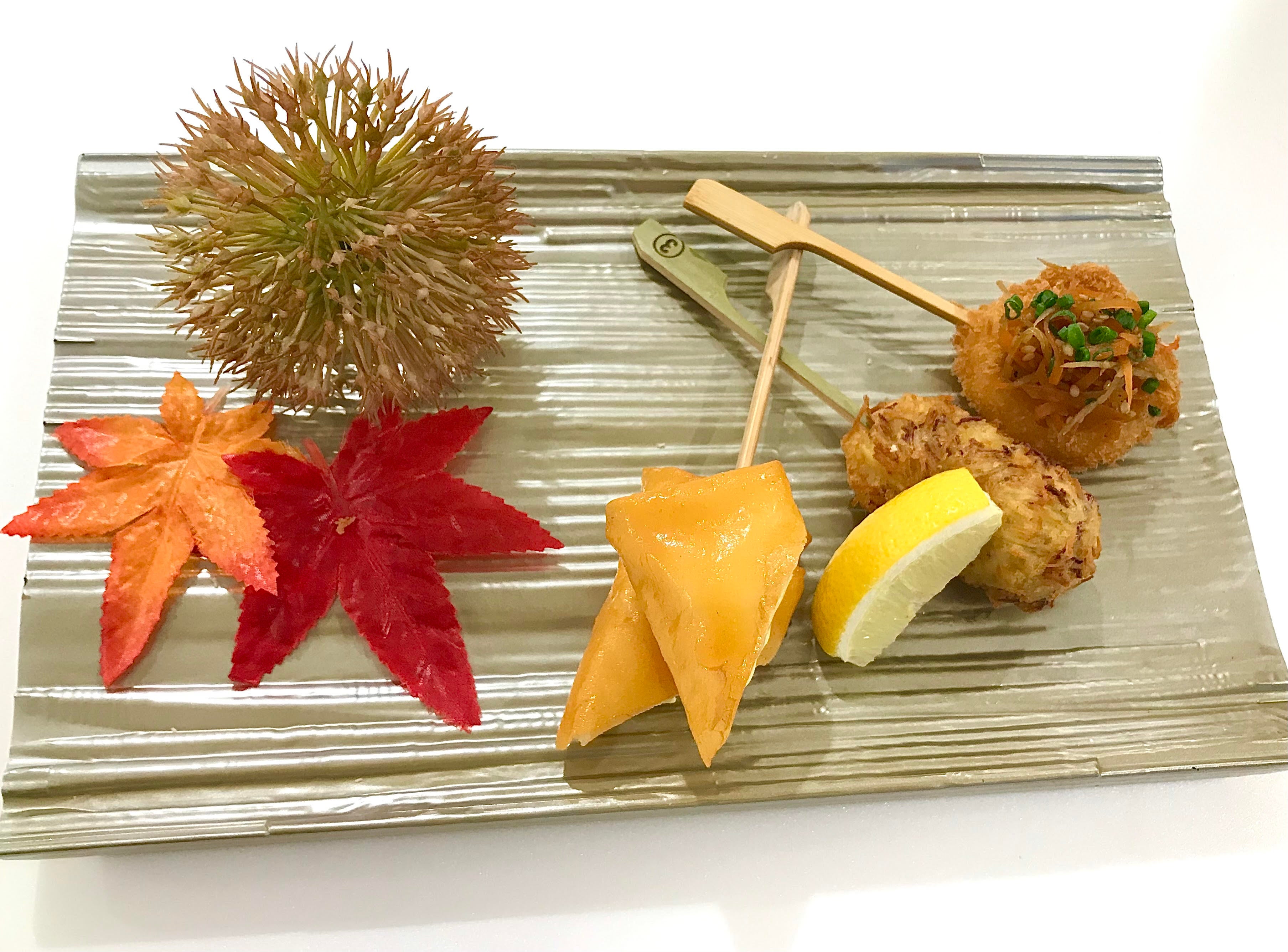 【さつま芋豚バラ巻き】レモンでさっぱりと煮たさつま芋を豚バラで巻き、さつま芋の皮で作った衣をでサクサク食感を追求しました。