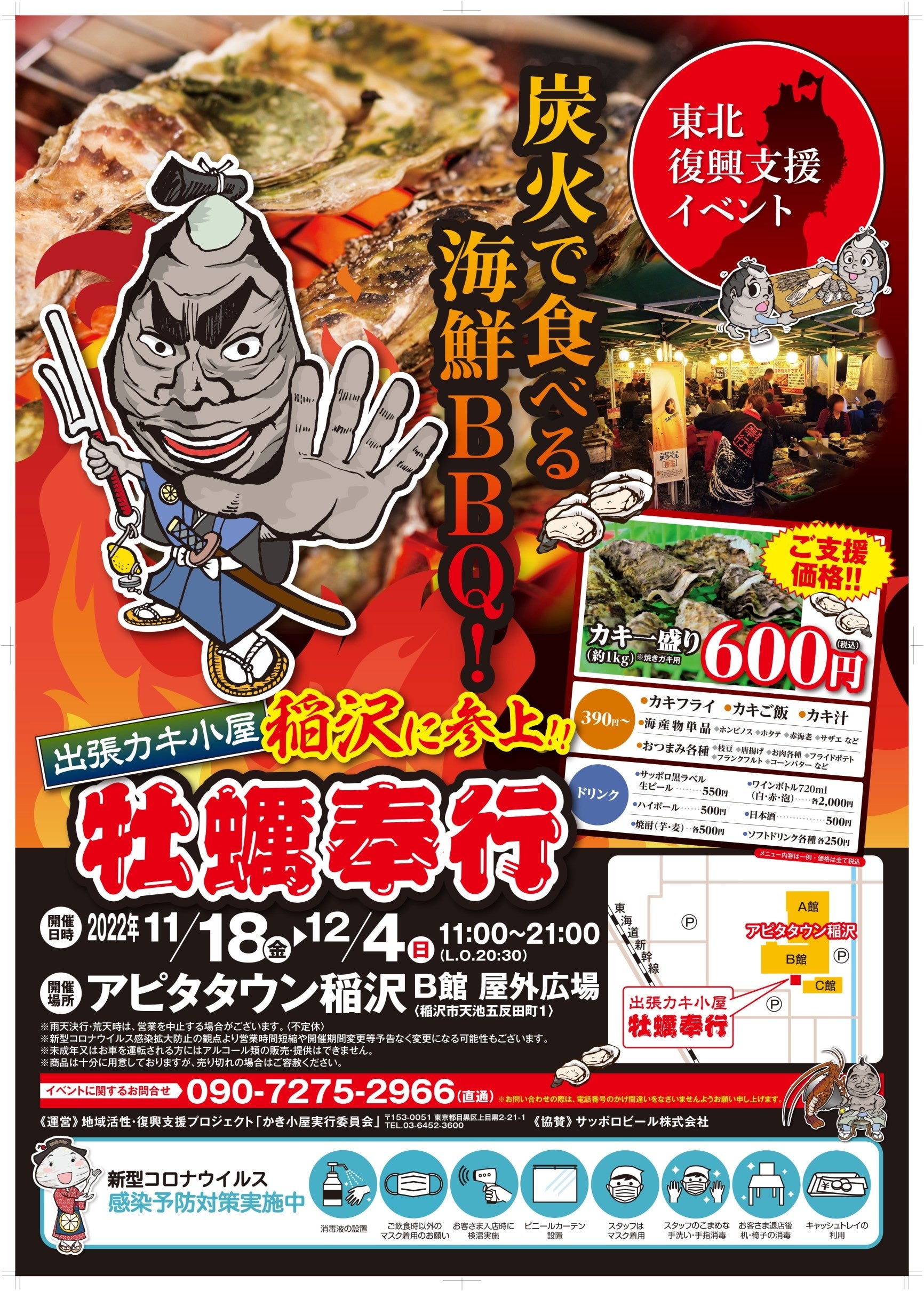 宮城県石巻の牡蠣をセルフ炭火焼き(海鮮BBQ)で楽しむ「出張カキ小屋 牡蠣(かき)奉行」(TEL 090-7275-2966)がアピタタウン稲沢(愛知県稲沢市)に期間限定オープン。期間は11月18日〜12月4日