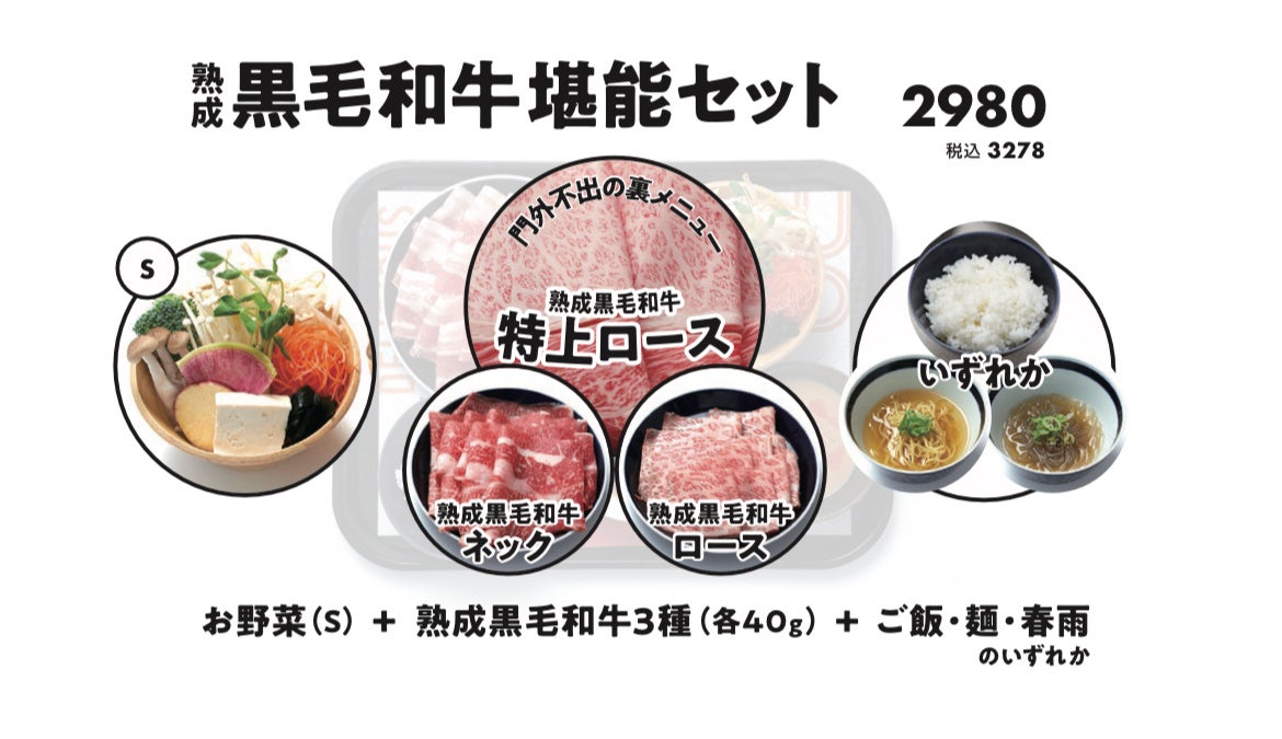 - 第一弾:熟成黒毛和牛堪能セット3,278円がなんと1,000円で食べられる!