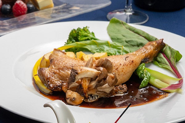 骨付き鶏モモ肉のロースト モリ―ユ茸のアラクレームとトリュフ香る茸ソースで
