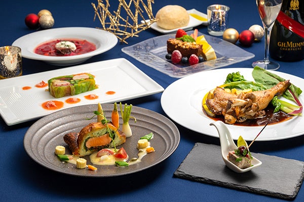 - 骨付き鶏モモ肉のローストやサーモンのアンクルートなど クリスマスにふさわしい華やかな全6品からなるディナーコース