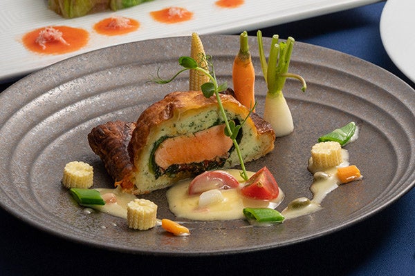 サーモンの柔らかな食感とムースの滑らかさ、そしてパイのサクサク感が三位一体となった食感を楽しんでいただく一皿です。