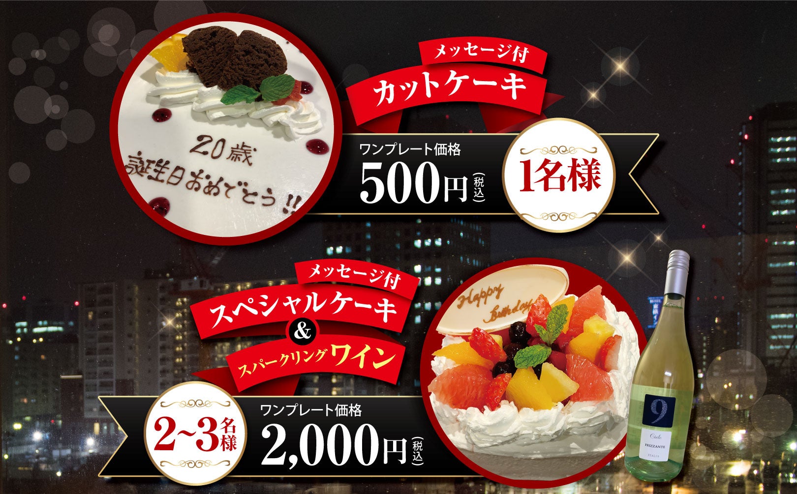 『スペシャルケーキ』以外にも、1名様用のカットケーキをご用意する税込500円のプランと、『スペシャルケーキ』にスパークリングワイン1本が付いた税込2,000円のプランをご用意しておりますので、人数や用途に合わせてお選びいただけます!