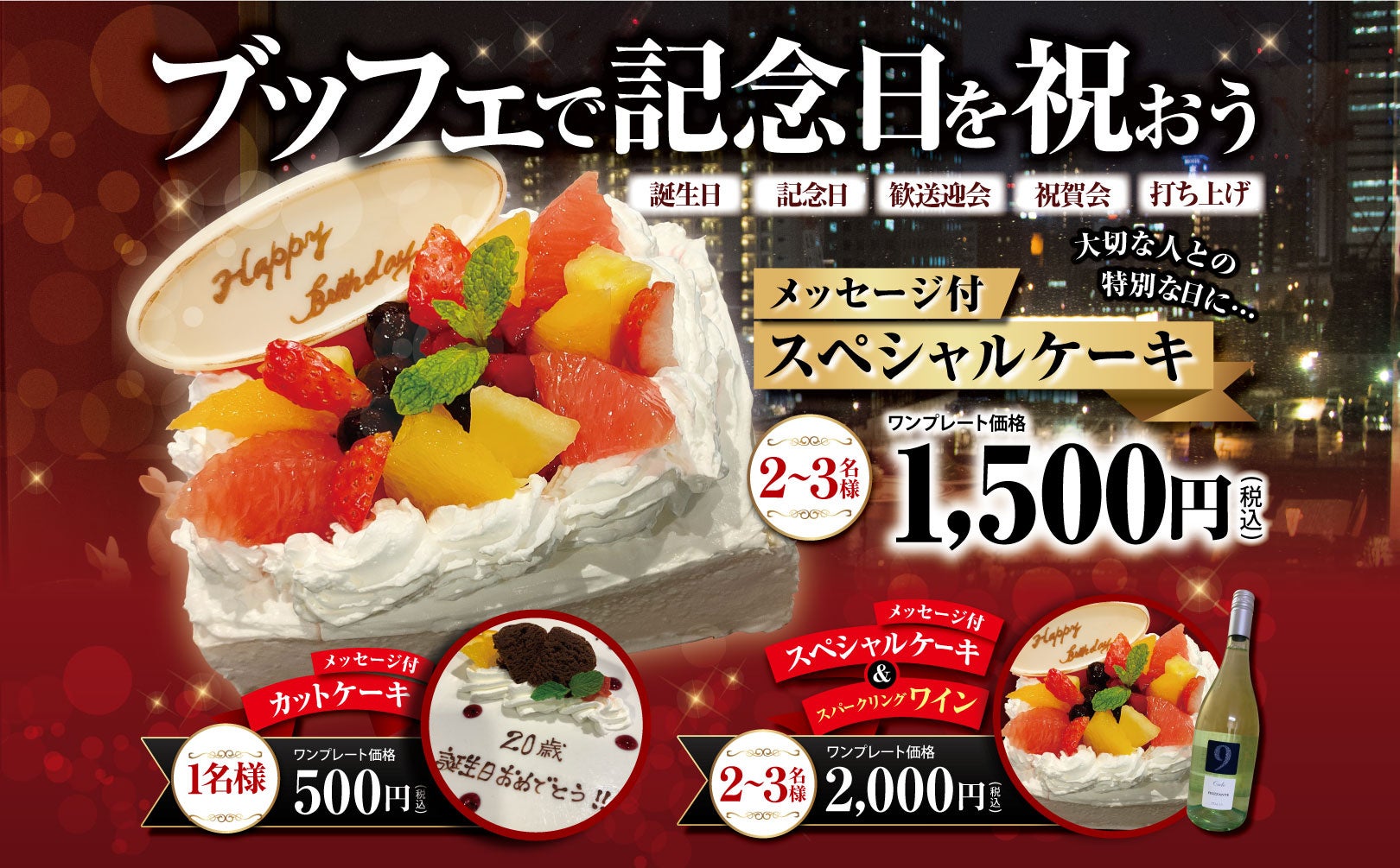 是非、特別なお祝いの日は、食べ放題とともに『スペシャルケーキ』で心に残るひとときをお過ごしくださいませ。