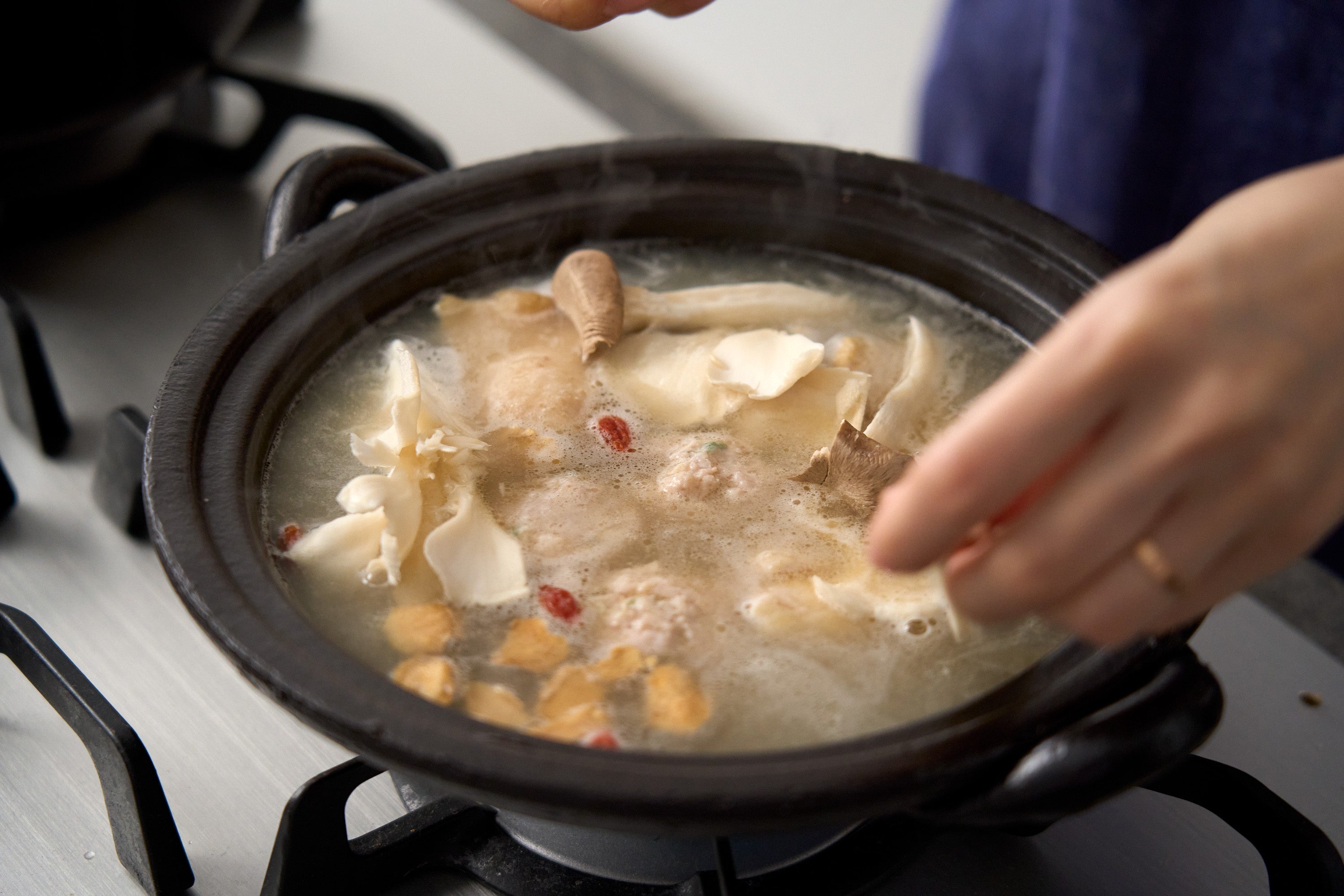 「白養なべ」は、白湯スープに生姜・クコの実・ハト麦・クローブ・白胡椒の和漢素材入り。お好みの具を入れてお楽しみいただけます。