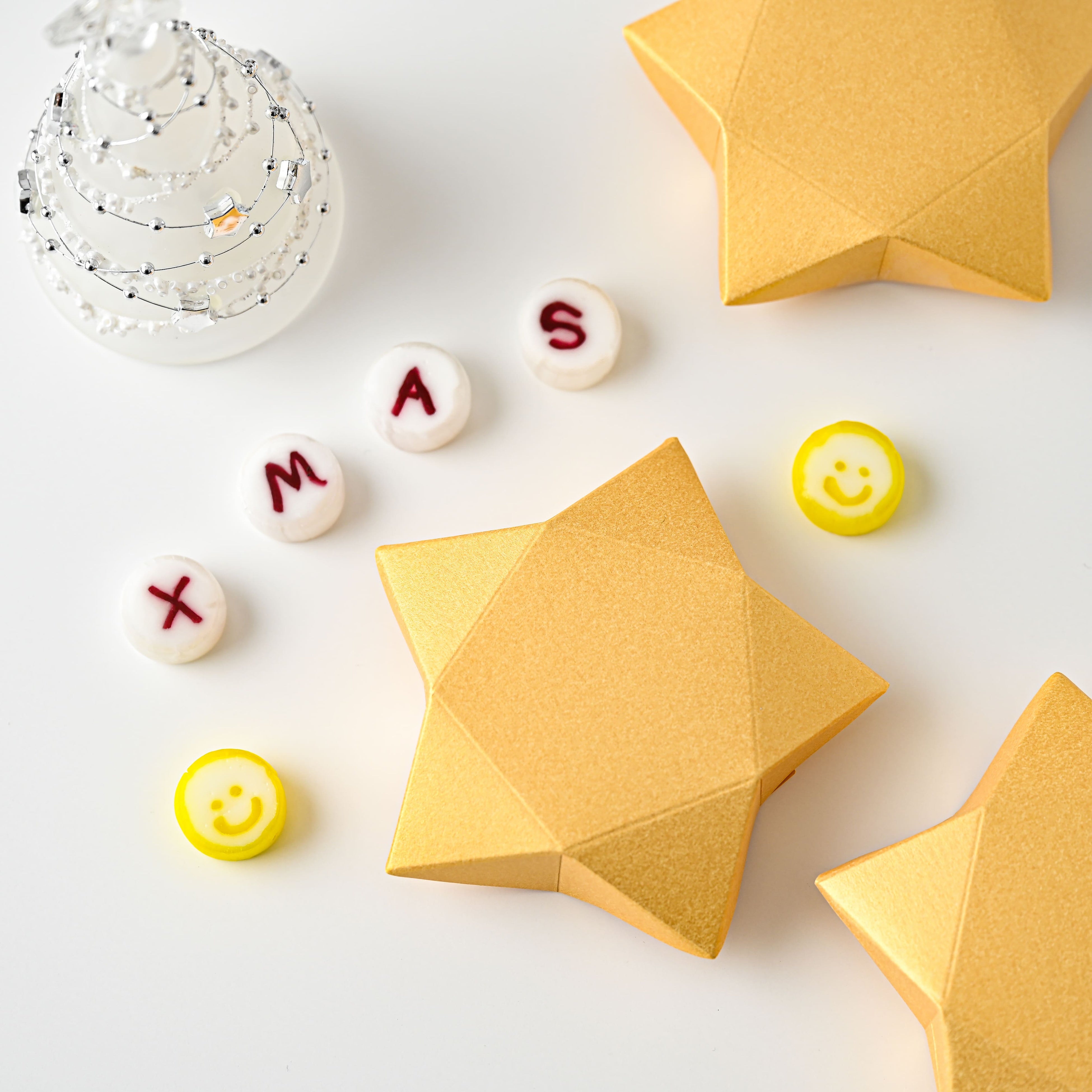 夜空に輝く星たちをイメージしたほのかにきらめくゴールドの星型ケースに、アルファベットと絵文字の丸い組あめが6粒入ったクリスマスシーズンの限定商品です。