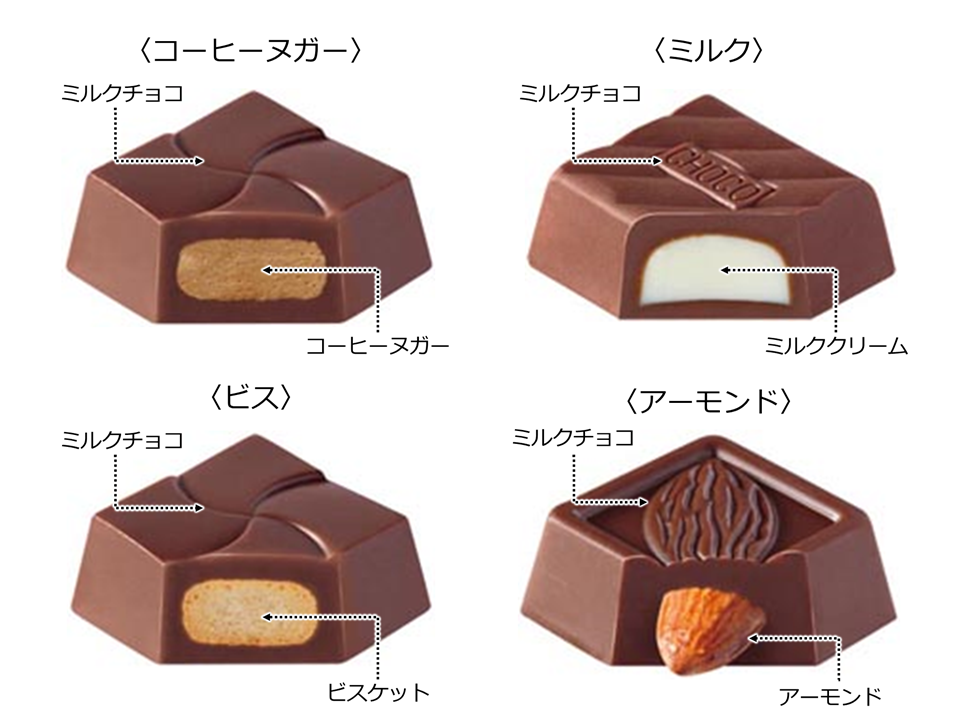 ビス、アーモンド、ミルク、コーヒーヌガーの、定番フレーバー4種類で様々な食感が楽しめます。