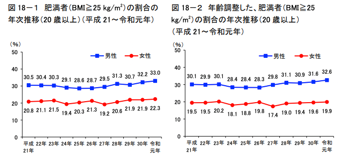 ・男性(20歳以上)では、肥満の割合がやや増加傾向