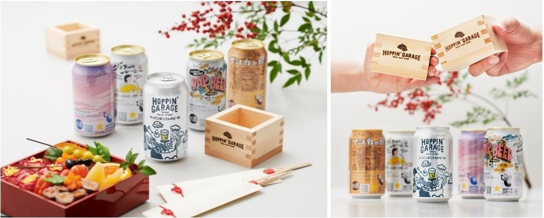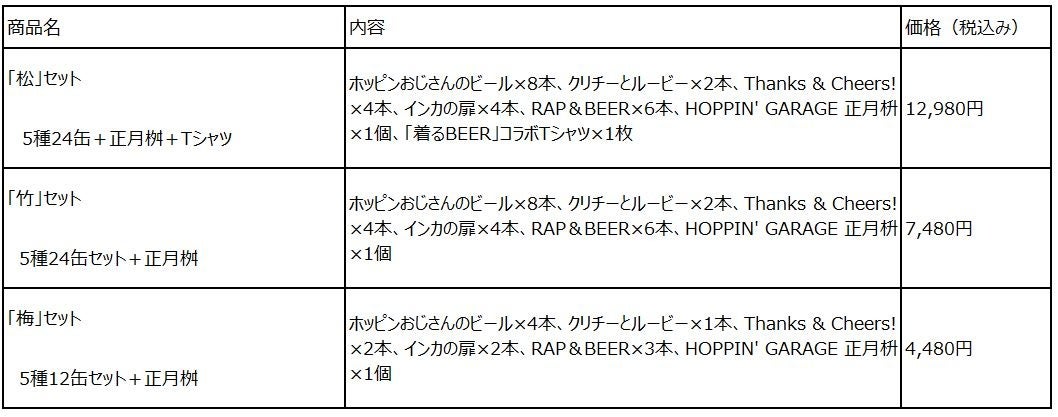 本商品は、「松」「竹」「梅」の3アイテムで、それぞれ「HOPPIN’ GARAGE」の今までに発売した人気商品5種詰め合わせと限定グッズをお楽しみいただけるお得な福袋です。商品には、本ブランドのフラッグシップビールの「ホッピンおじさんのビール」のほかに、今までに発売した「HOPPIN’ GARAGE クリチーとルービー」、「HOPPIN’ GARAGE インカの扉」や、数量限定新発売の「HOPPIN’ GARAGE RAP & BEER」をラインナップしています。限定グッズには、「HOPPIN’ GARAGE」の焼印が入った正月枡をご用意。「松」セットでは「HOPPIN’ GARAGE RAP & BEER」の企画者であるラップグループP.O.P(ピーオーピー)の上鈴木兄弟が手掛けるアパレルブランド「着るBEER」(注2)とコラボレーションしたTシャツも取り揃えています。クリスマスや年末年始を華やかに彩るお得なセットです。当社は「HOPPIN’ GARAGE」を通して多様性あふれるビールを生み出し、そのストーリーを味わいながら飲むという、新たなビールの楽しみ方を提供することで「新しいお酒のある豊かな社会と生活」に貢献していきます。