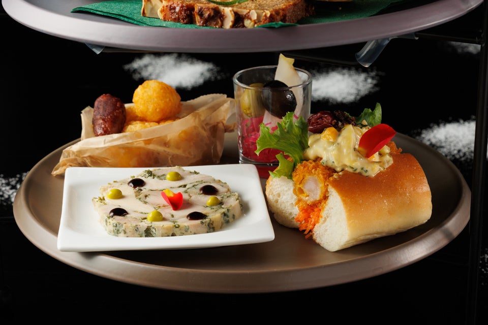 下段には、見た目が万華鏡のように華やかな「チキンとハーブのテリーヌ」や、ドッグパンにはアボカドバターを塗り、サクサクの海老フライと具沢山のタルタルソースが楽しめる「海老カツドッグ」などがご堪能いただけます。