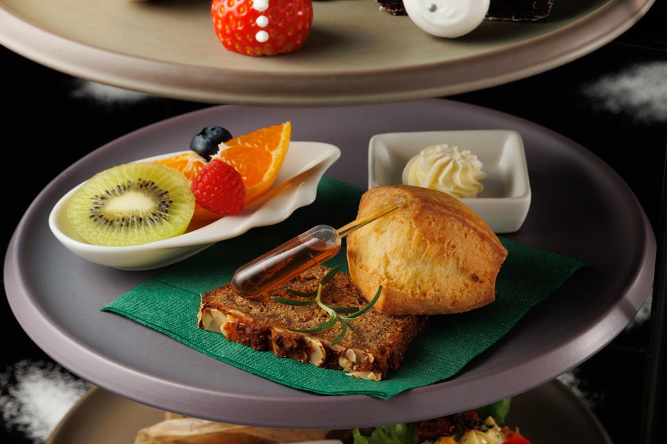 中段には、蜂蜜をたっぷり入れ焼き上げたフランスの伝統菓子「パン・デピス」をご用意。スパイスの香りと優しい甘さが冬にぴったりの一品です。その他、コクのある定番のクロテッドクリームとメープルシロップで楽しむ「スコーン」、「フルーツ盛り合わせ」がお楽しみいただけます。
