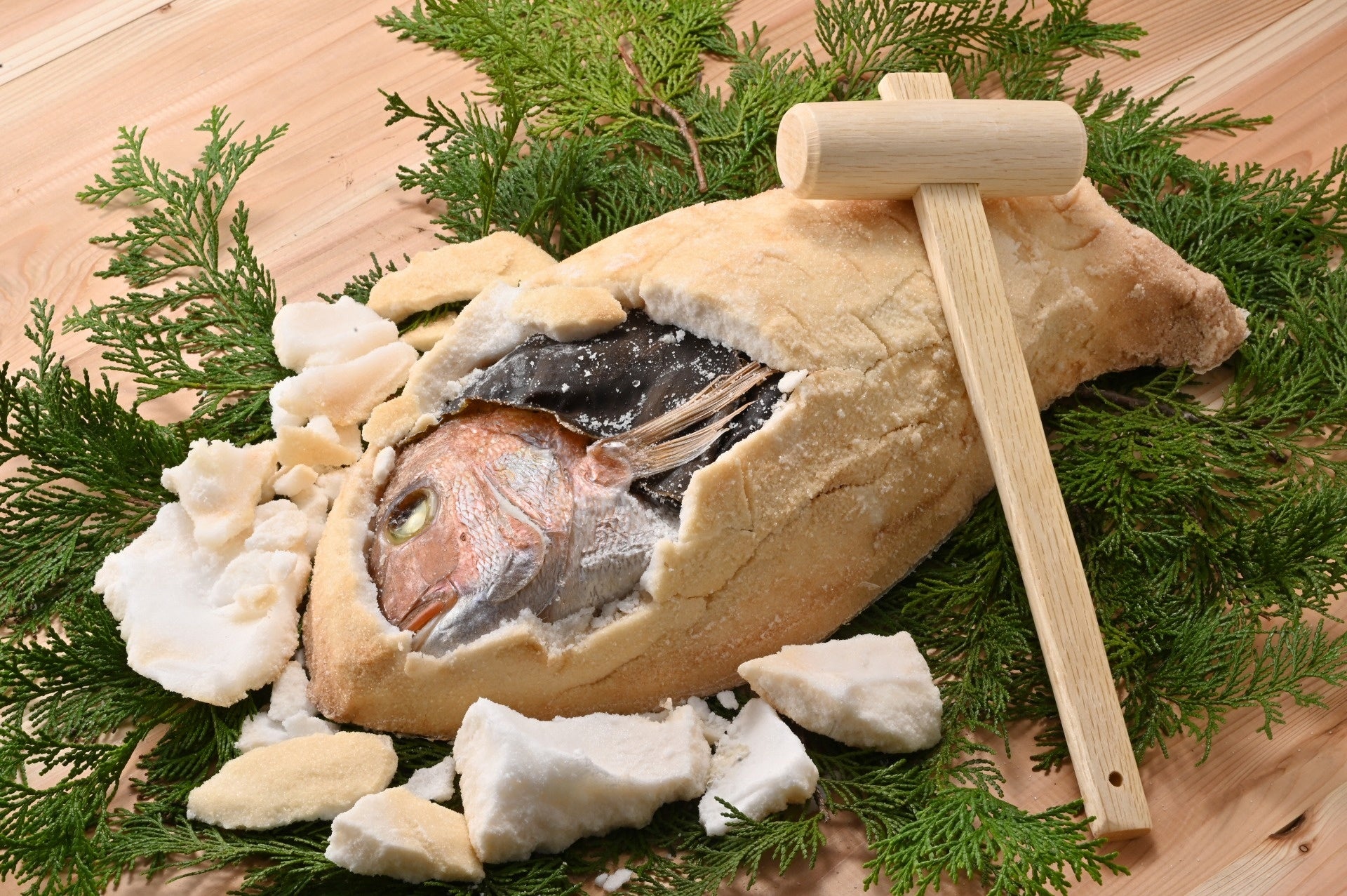 「包みを開けると、鳴門のうず塩で固められた魚がお目見え。付属品の木槌で塩を割ると、鮮やかなピンク色の真鯛の美しさに大きな歓声があがるでしょう。塩味と昆布の風味が程よく効いた上質な味わいをご堪能ください。身を食べ終わったあとは、頭や骨をだしにして、潮汁やお茶漬けにしても美味しくいただけます」(齊藤料理長)