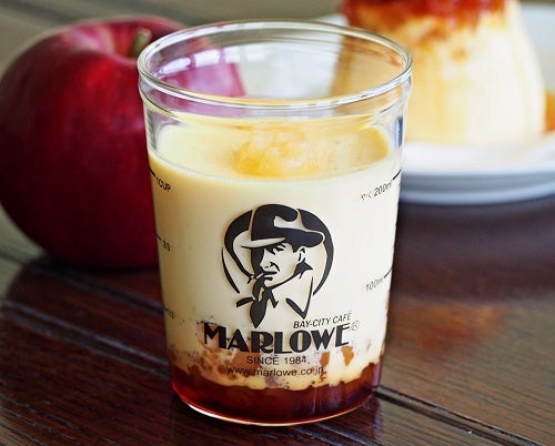 じっくり湯煎焼きしたカスタード生地にきめ細かなスポンジを敷き、りんごの角切りととろけるクリームを