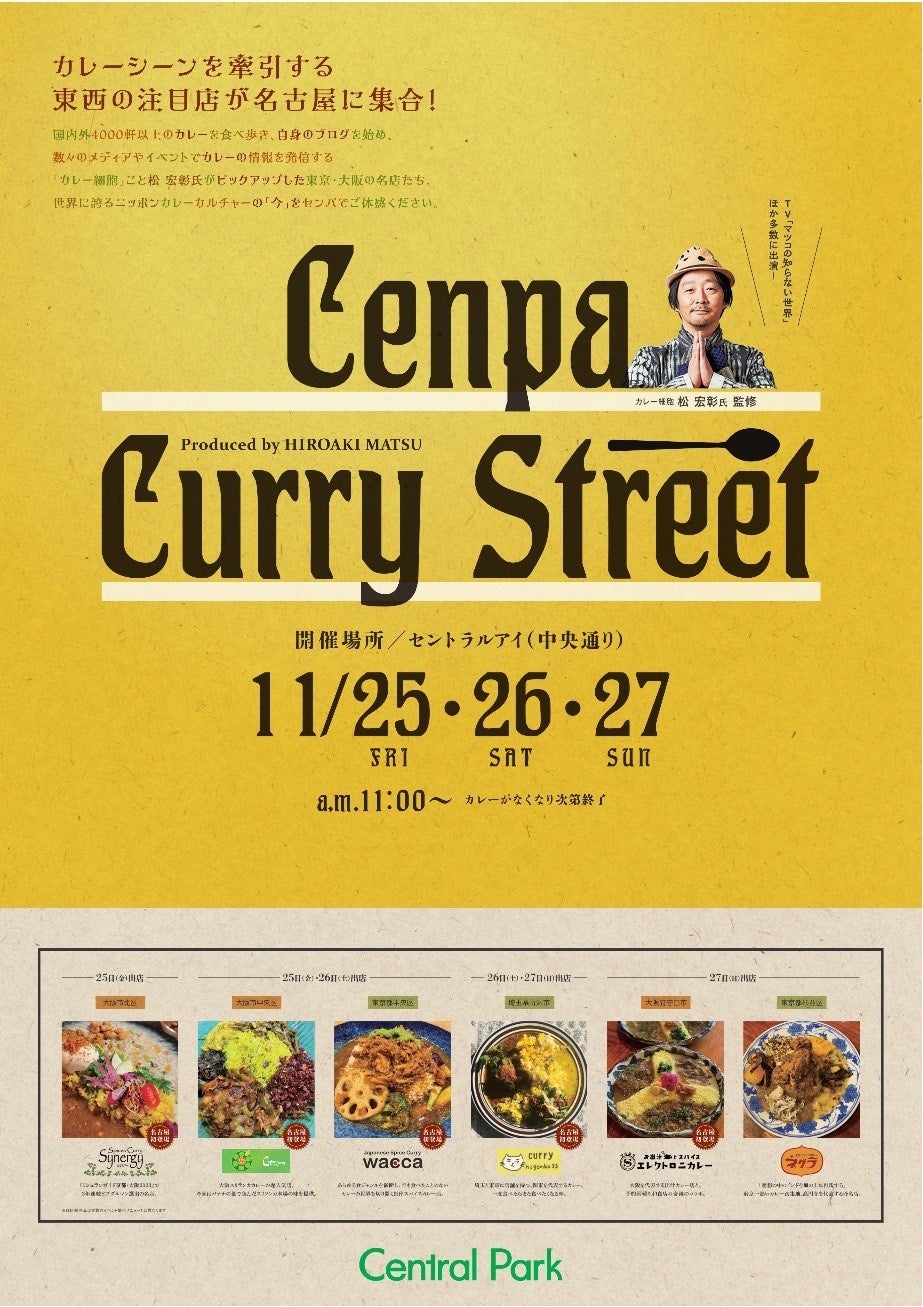 セントラルパークは、11月25日(金)~11月27(日)の3日間限定で、「Cenpa Curry Street(センパ カレーストリート)」を開催いたします。国内外のあらゆるカレーを食べ歩いてきた”カレー細胞”こと松 宏彰氏(まつ ひろあき)が名古屋の皆様に特別に選んだ東京・大阪の人気カレー店、名古屋初登場5店を含む6店が登場します。カレー好きはもちろん、情報感度の高いグルメの方々にも楽しめるイベントをお届けします。カレーの多様性を感じる、各店自慢のメニューを揃えてお待ちしております。