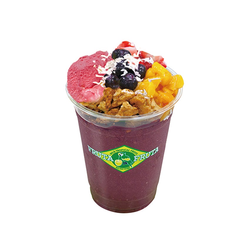 フルッタフルッタの特製濃厚アサイーボウル。フルーツとグラノーラのトッピングに加え、ココナッツとピタヤアイスも盛り込んだ豪華版です。食べ歩きし易いようドリンクカップに盛りつけてご提供します。