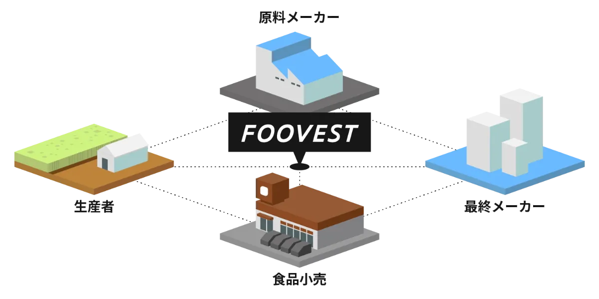 「FOOVEST」は、国内で約30兆円のマーケットである食品加工市場において、食品メーカー向けの加工原料調達サービスとして2021年3月にサービスを開始しました。全国の産地や加工会社をネットワーク化し、効率的な受発注で多くの食品メーカー企業をサポートしています。現在、榮太樓總本鋪、Mr.CHEESECAKE、BAKEなど、数多くの食品ブランドにご利用いただいております。