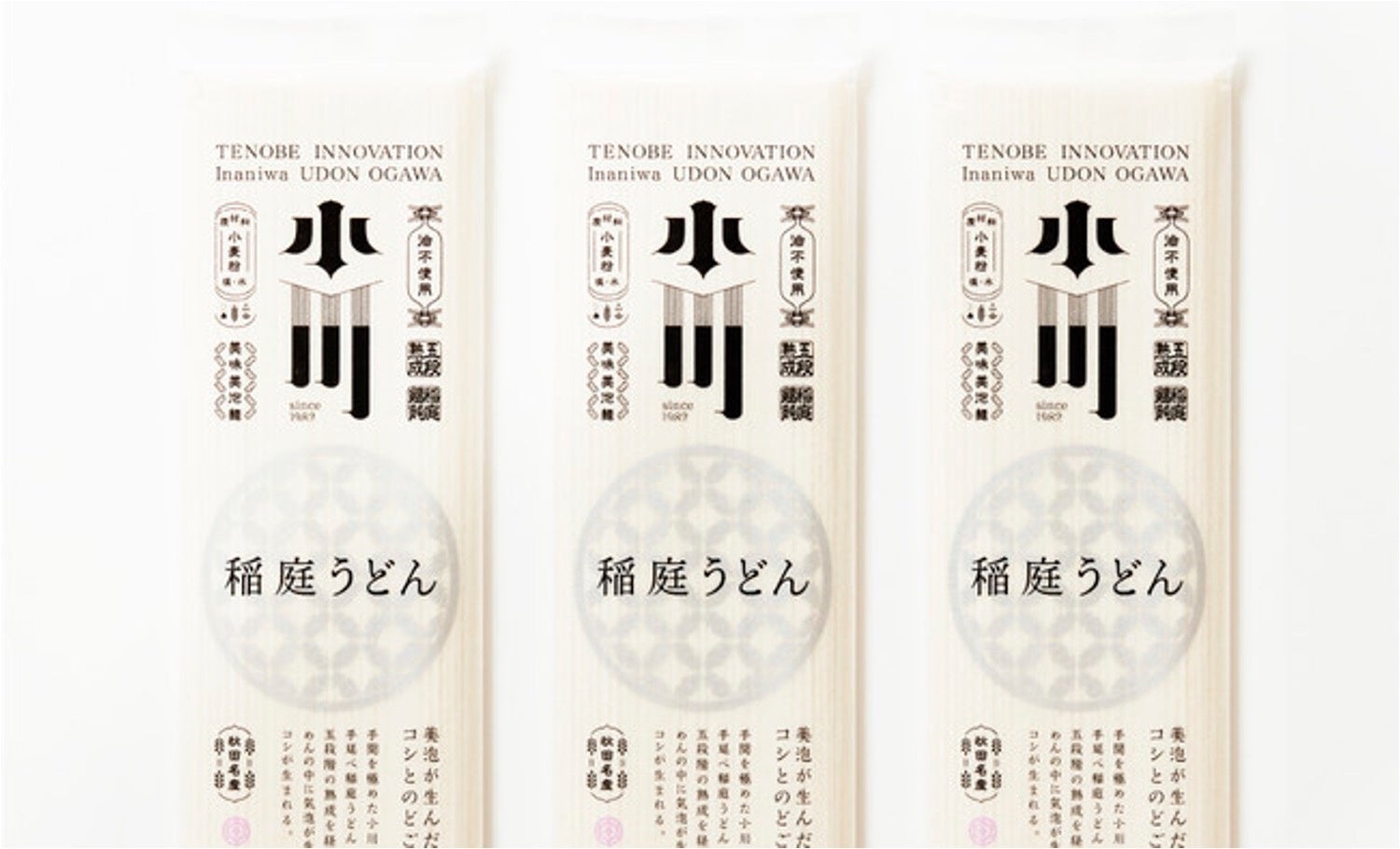 「稲庭うどん小川」のこだわりを一つひとつ「判子」としてパッケージに刻印することで魅力を表現しています。