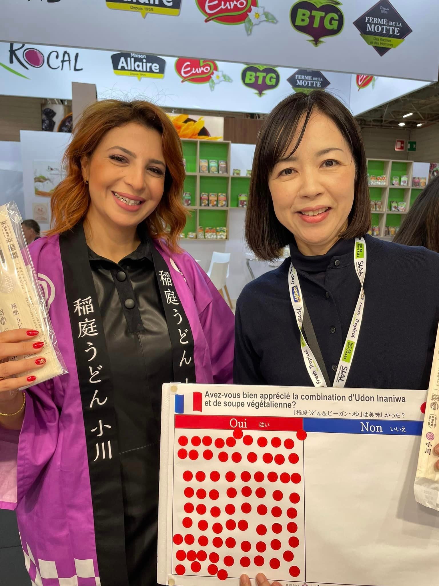 - ヨーロッパはビーガン人口が多く、動物(かつお)を使わないつゆは好評だった。アンケート回答者76名中全員が稲庭うどんとビーガンつゆを美味しいと評価
