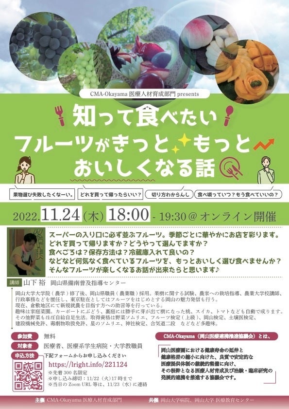 国立大学法人岡山大学(本部:岡山市北区、学長:槇野博史)の岡山大学病院と大学院医歯薬学総合研究科医学教育センターは、CMA-Okayama(岡山医療連携推進協議会)医療人材育成部門主催で2022年11月24日(木)にオンライン開催されるweb特別セミナー「知って食べたい フルーツがきっともっとおいしくなる話」に共催します。