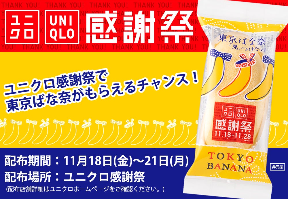 「ユニクロ感謝祭」に『東京ばな奈』が再び参加決定~!11月18日(金)~21日(月)の4日間限定で開催される特別企画「全国銘菓祭」企画にて、ユニクロ店舗にご来店のお客様に「東京ばな奈」が1個プレゼントされる事となりました。「東京ばな奈は初めまして」な方も、「東京ばな奈が大好き」な方も、ぜひこの機会にユニクロで「冬のファッション」と「東京ばな奈」を“見ぃつけたっ”してくださいね。