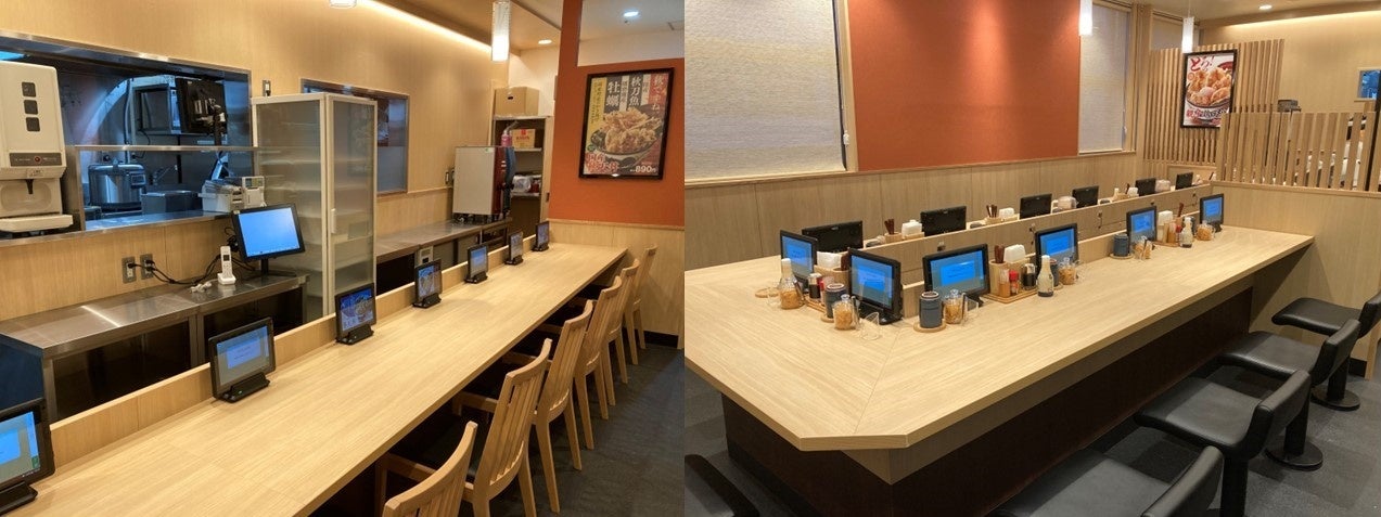 「天丼てんや」の新型店舗では店舗デザインや居住性の高い設計と、システムなどの見直しによりお客様の利便性向上を図ることで、国内でのナショナルブランド化に向けたドミナント出店を推進してまいります。今回、新型店舗第一号店として、「天丼てんやエキア北千住店」を11月10日(木)にリニューアルオープン。店内はカウンター席のみとして、ご注文はタブレットでお客様ご自身のタイミングで行っていただき、会計はセミセルフレジを導入するなど、過去にテストを重ねた取り組みや新たな取り組みを1つの店舗に集めました。社会情勢や変容するお客さまのニーズに合わせ、サービス拡充とよりスピーディな提供を実現いたします。