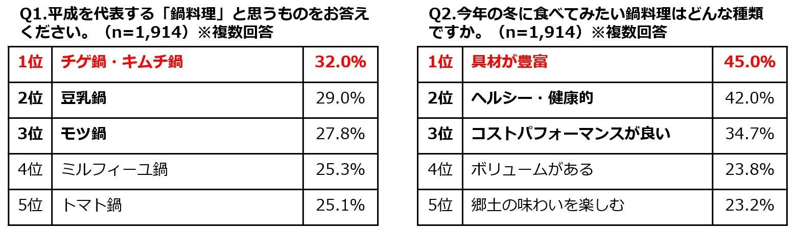 ・平成を代表する鍋料理は「チゲ鍋・キムチ鍋」が32%で1位、次いで「豆乳鍋」「モツ鍋」がTOP3に。