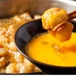 もつ鍋を「すき焼き」風に食べる新感覚鍋の「もつすき鍋」です。プリップリのモツを、新鮮な卵にサッと潜らせて食べます。 もつの旨味と卵の甘味の究極コラボレーションを実現しました。自家製の割下出汁に厳選の和牛小腸のみを使ったモツを使用した、「とりのてつ」の人気No.1メニューです。