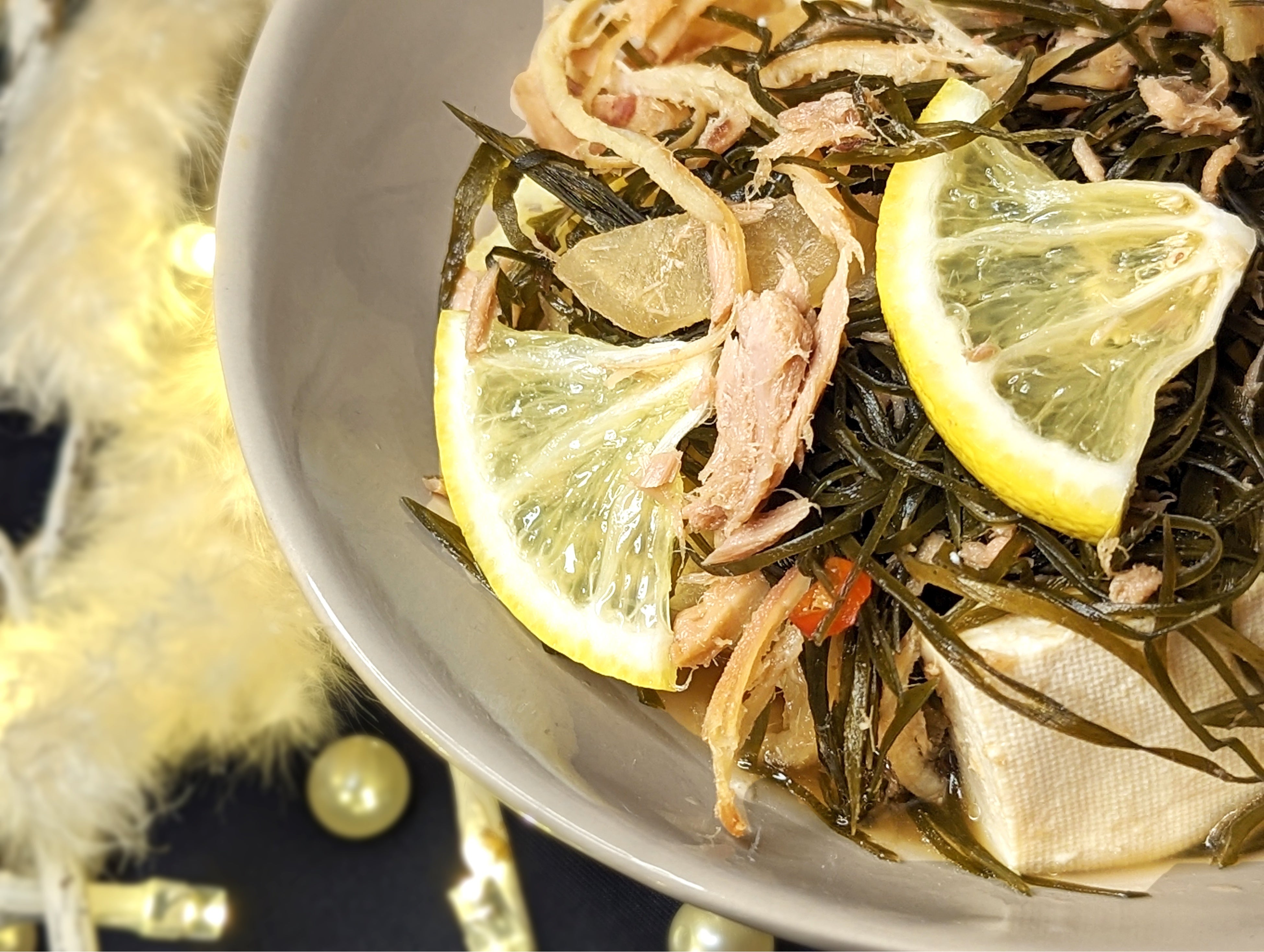 昆布の名産地 北海道産の昆布と、スルメイカをたっぷりと使用した「北の郷土料理 松前漬け風豆富」は、シャキシャキとした昆布に、スルメイカとツナの旨味が噛むほどに広がり、さらにカボスの爽やかな香りが後を引く、豆富のサラダです。