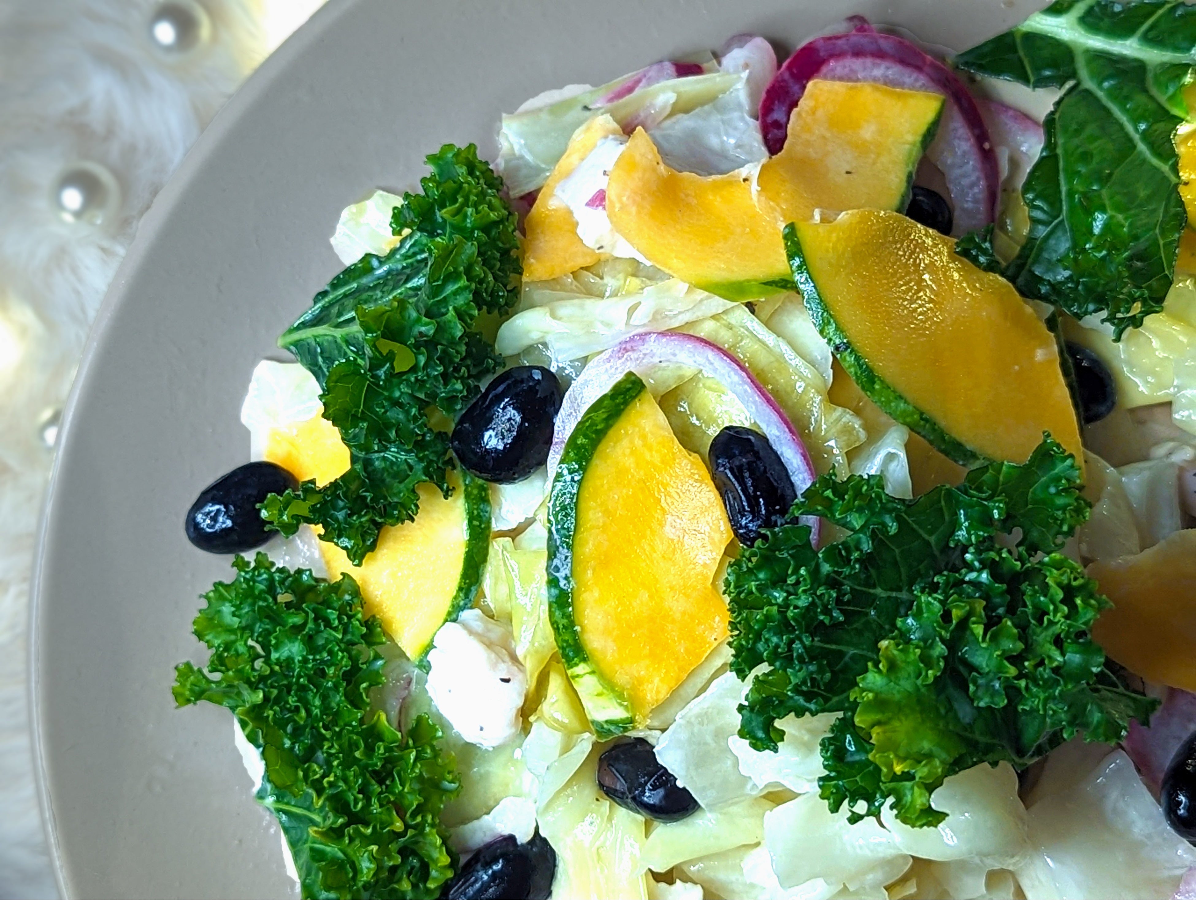 生でも美味しい鈴かぼちゃ。シャキシャキとした食感が心地よく、さっぱりとしたサワークリームとよく合います。北海道産赤玉ねぎ、ケールやキャベツ、チキンと多品目で、黒豆の甘みがふんわりと包み込みます。