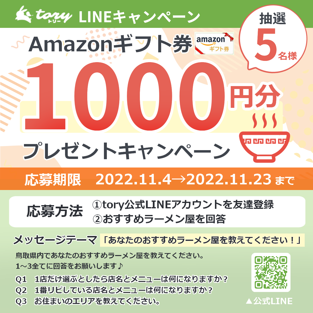鳥取の女性向けにグルメ・イベント情報を発信するメディア「tory」(本社:鳥取県鳥取市、代表:大森誠)が、公式LINEにて11月4日よりキャンペーンを開始しました。