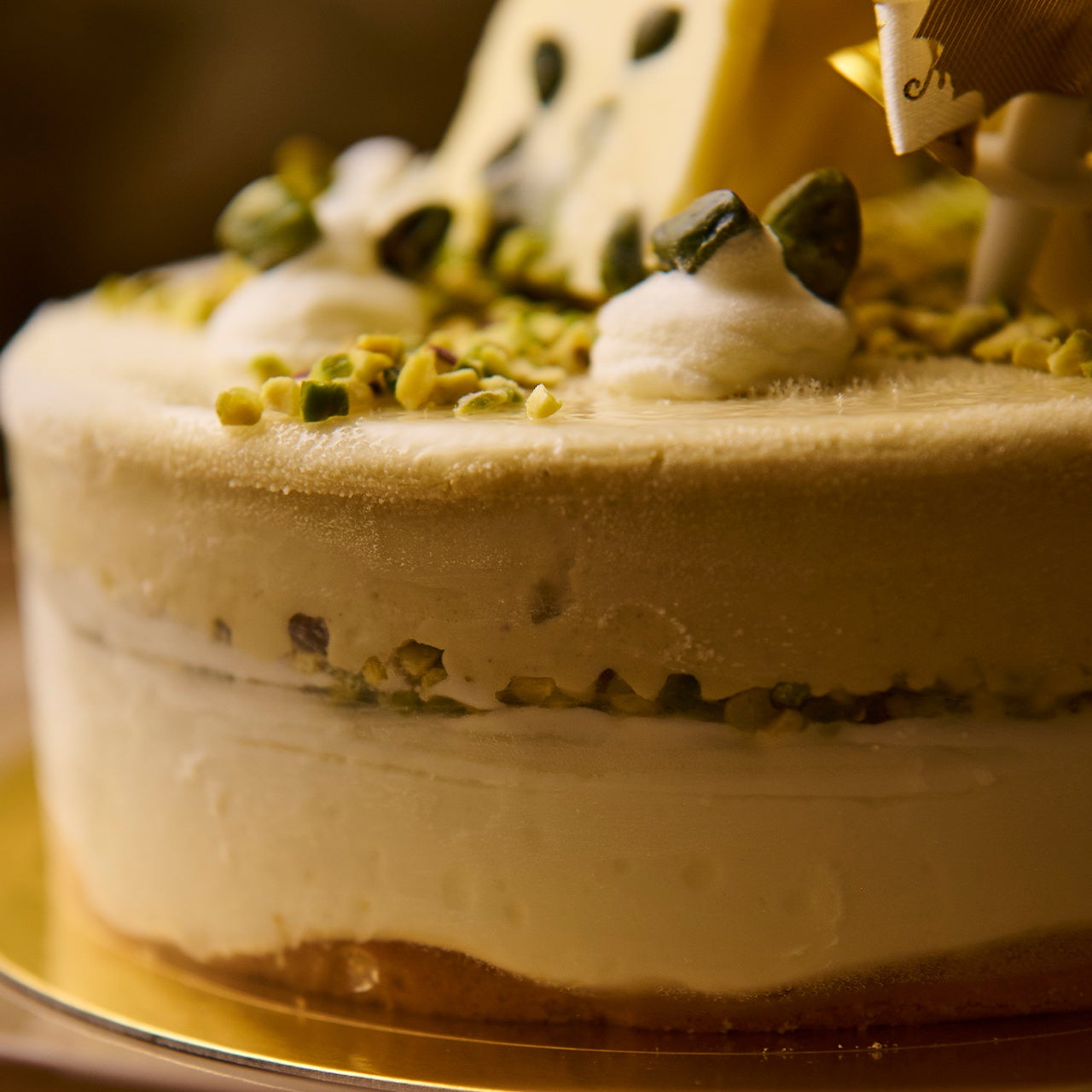 ミルクとピスタチオの2種類のジェラートを使ったアイスケーキ。ジェラートの間に、砕いたピスタチオを使い、ピスタチオ尽くしのケーキです。