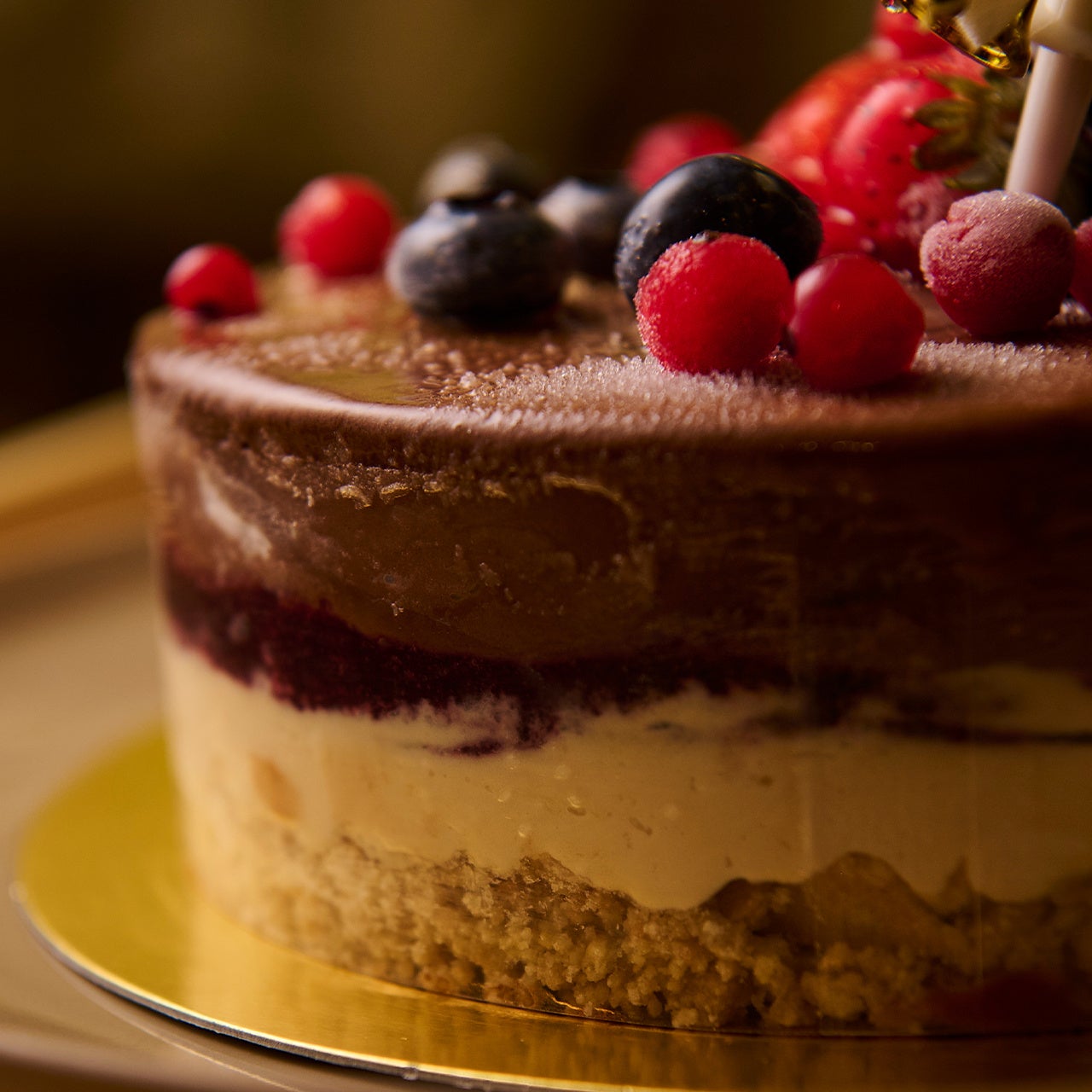 キャラメルとチョコレートの2種類のジェラートを使ったアイスケーキ。ジェラートの間に、ミックスベリーソースを使い、酸味と甘さのバランスが取れたケーキです。土台部分には砕いたクッキーを使い、食感も楽しめます。