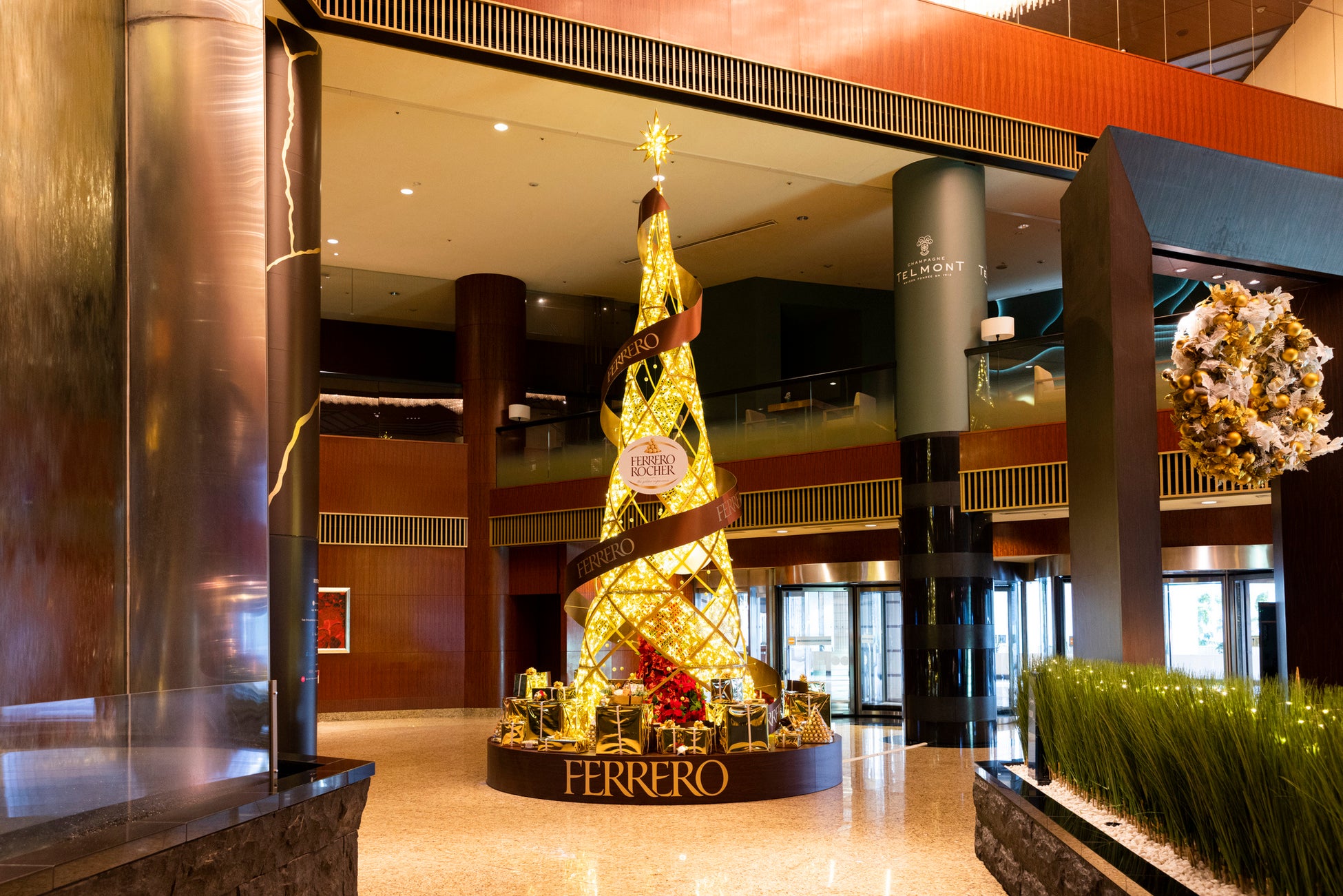 高さ7mを超えるフェレロ ロシェのクリスマスタワーが、ANAインターコンチネンタルホテル東京に登場。フェレロ ロシェのゴールドに輝くクリスマスタワーがホテルのロビーを彩ります。