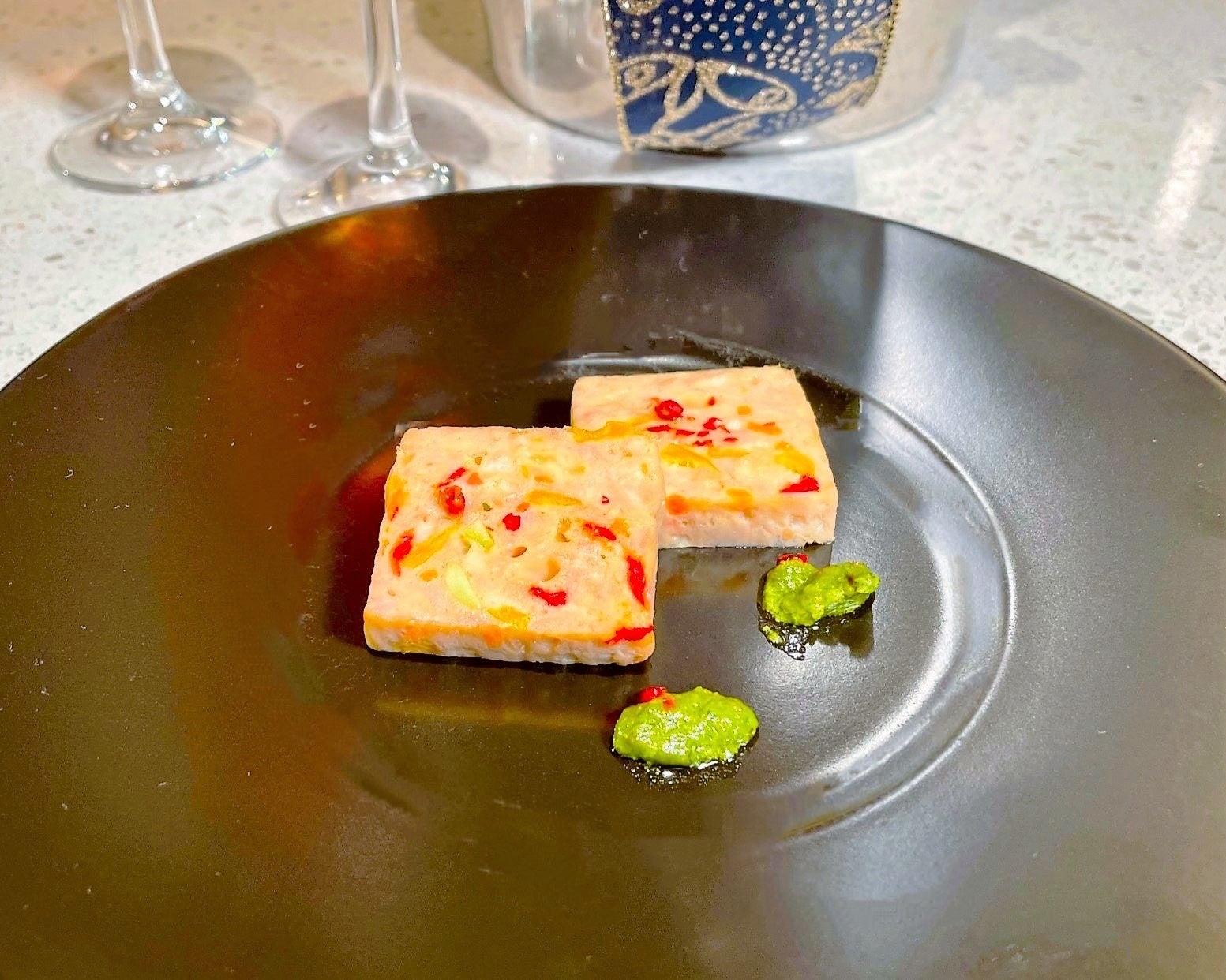 ◆チキンテリーヌ 春菊のソース Chicken terrine with crown daisy sauce