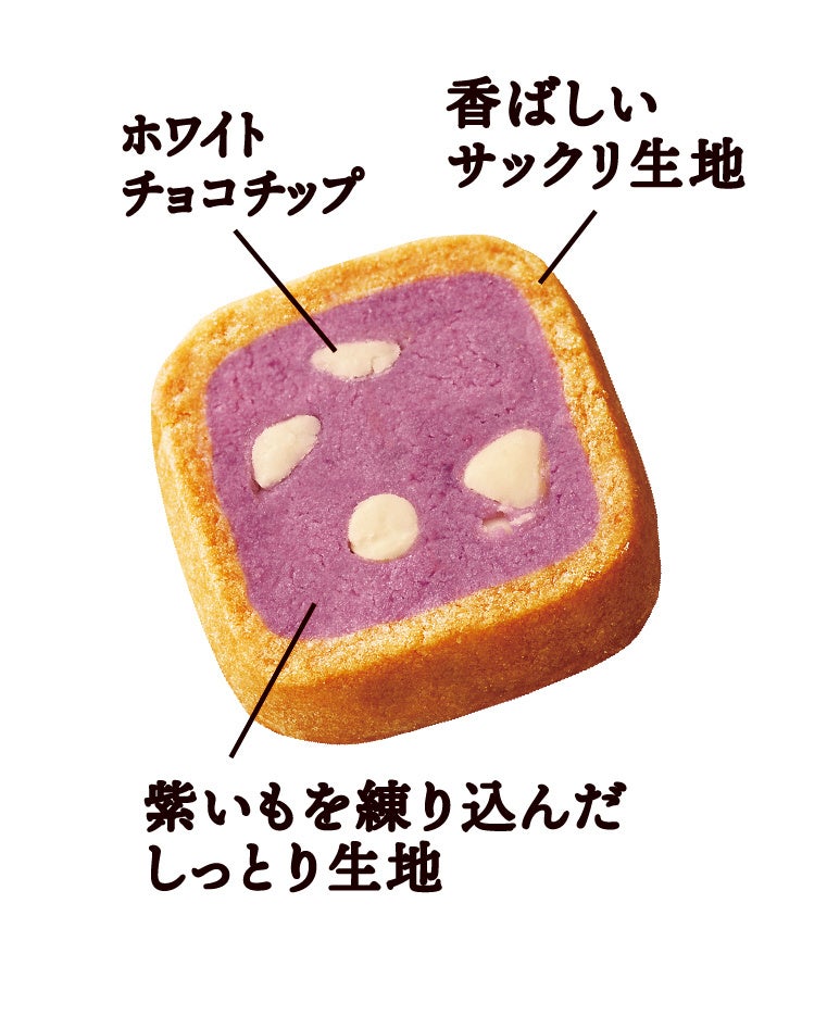 ・紫いもペーストとホワイトチョコチップを練り込んだしっとり生地を、香ばしいサックリ生地で包み込み焼き上げた、プチタルトをイメージしたクッキー