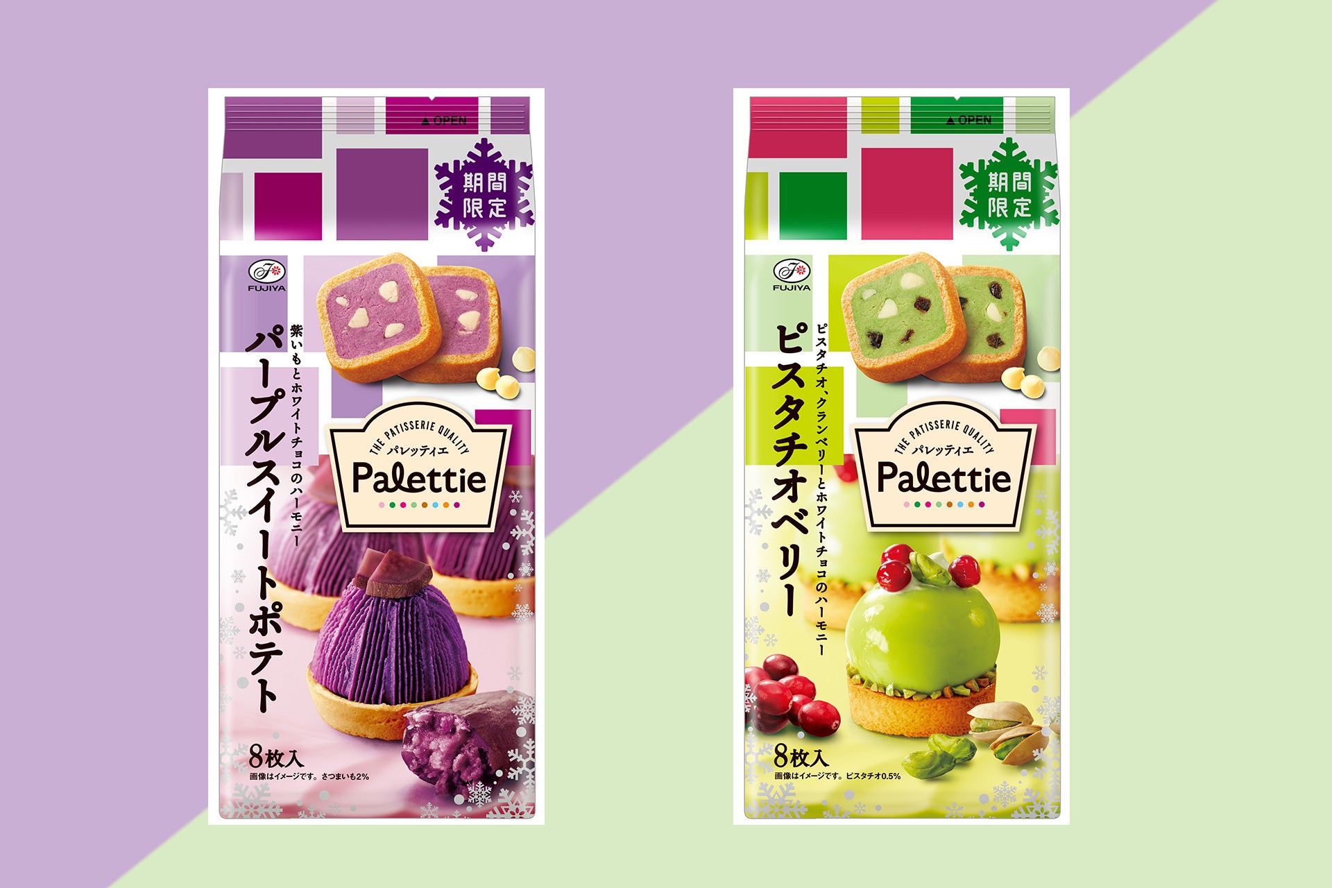 2022年5月に登場した不二家のクッキー新ブランド「パレッティエ」より、期間限定のフレーバー「パープルスイートポテト」と「ピスタチオベリー」を、2022年11月29日(火)より新発売します。