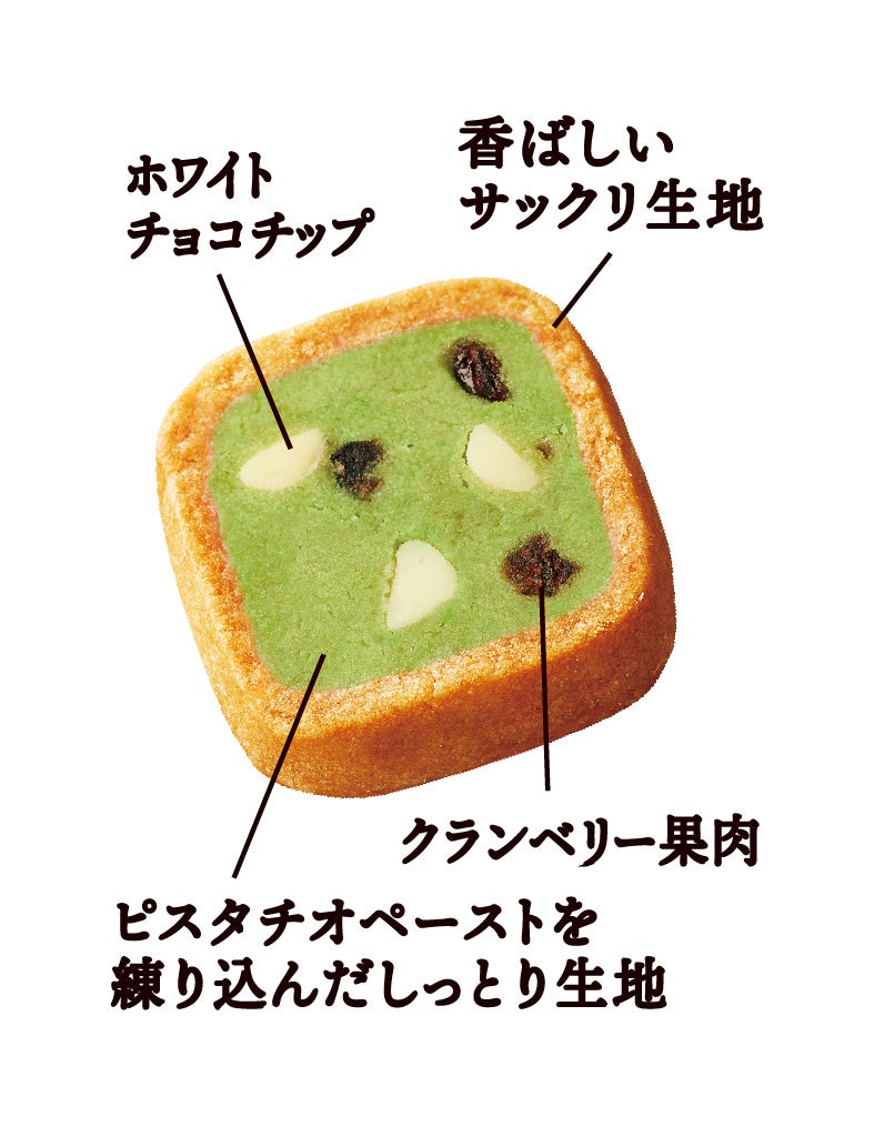 ・ピスタチオペーストとクランベリー果肉、ホワイトチョコチップを練り込んだしっとり生地を、香ばしいサックリ生地で包み込み焼き上げた、プチタルトをイメージしたクッキー
